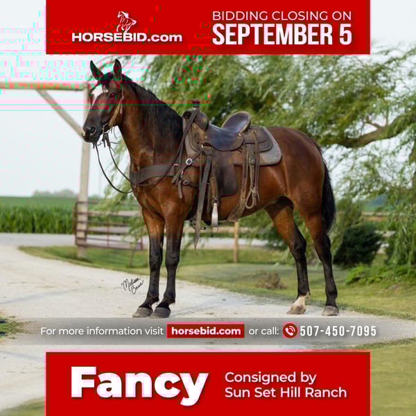 LABOR DAY *EXTRAVAGANZA* - Happening now thru MONDAY | SEPTEMBER 5 - Available EXCLUSIVELY on HorseBid's website! For more details and to register, visit www.horsebid.com CONSIGNOR CONTACT: Sun Set Hill Ranch 507-450-7095 LOCATION: Lanesboro, MN BREED: Morgan REGISTERED: Yes COLOR: Bay HEIGHT: 15.1 AGE: 4 GENDER: Mare SSH Fancy - Registered, 15.1 Hand, 4 year old, Bay, foundation breed Morgan mare. Broke to ride and drive single and double. This mare is a been there done that type of horse. She has been used on trails and does great with creek crossings and other obstacles. She is traffic safe both in saddle or driving. This mare stands to saddle and harness, will clip and bathe and will give absolutely no trouble for the farrier. She works well with kids and can do almost anything with them. She has experience with swinging a rope, roping livestock and dragging posts and tires. Fancy is a well-rounded horse that can be used for ranch work, trails, driving or as a family horse. As her name implies, she has that beautiful face and typey shape of body that would be "Fancy" in the show ring. She is a very likable horse with an easy-going personality. It would be hard to find another horse like Fancy with her qualities, amount of training and experience with this much life still ahead of her. Watch the video and see for yourself. LOCATION Lanesboro, MN