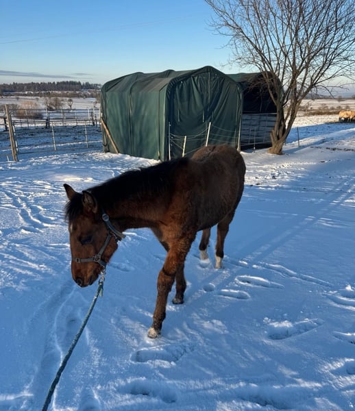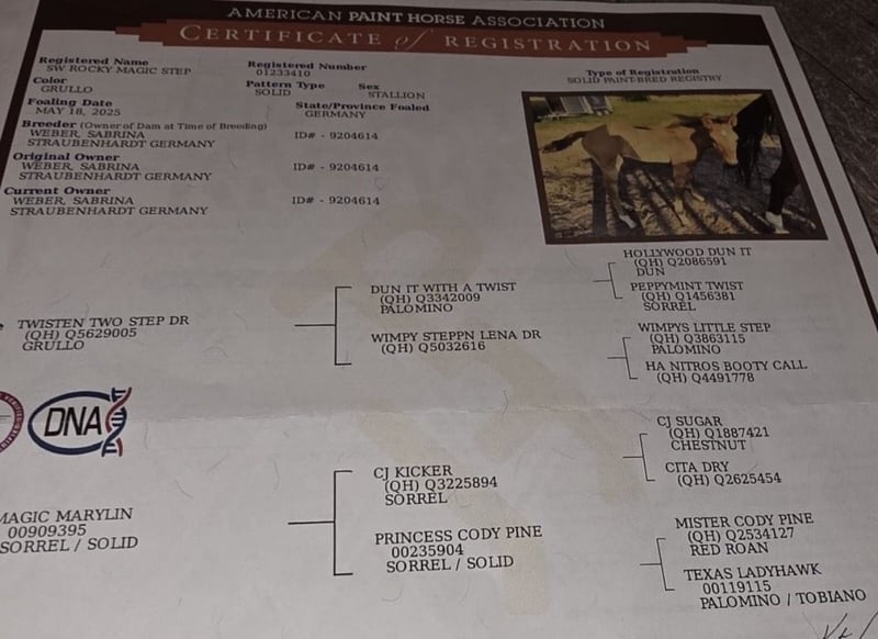 Zum Verkauf steht unser Rocky. Er ist am 18.05.2025 geboren und 4 Panel negativ und Pssm n/m. Er wächst bei uns mit anderen in einer kleinen Herde im Offenstall auf. Er ist sehr neugierig und verspielt. Er kennt das Halftern, gibt schon Hufe und lässt sich auch etwas Führen. Er sucht ein neues Liebevolles Zuhause am besten zu einem ähnlich altem Kumpel als Spielkameraden. Sein Vater ist Twisten two step dr. Platz vor Preis.