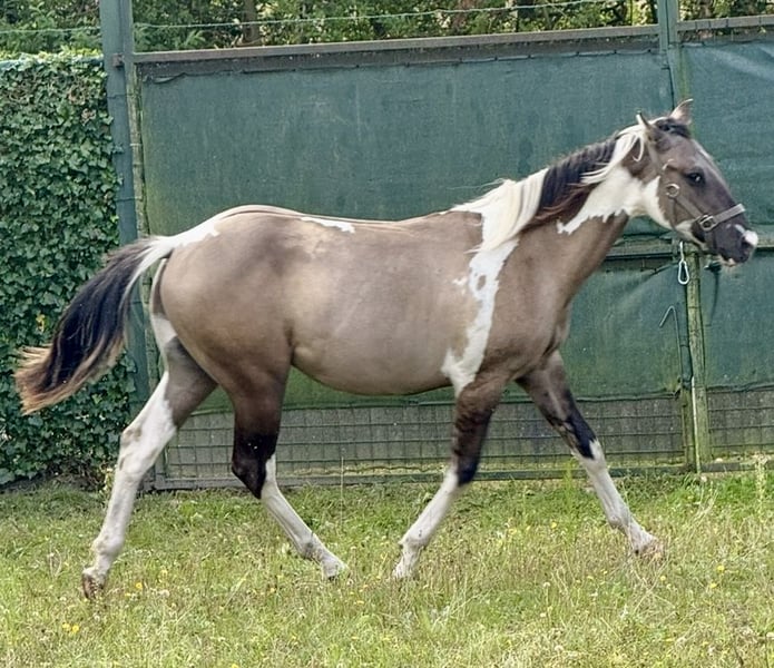 Potro APHA de color grullo Tobiano, homocigoto negro/tobiano (50 % de probabilidad de dilución dun con raya). EE aa Dd TT. Panel 7 NN. Un semental muy dócil, cariñoso y fácil de manejar. Pedigrí/pasaporte/vacunado y desparasitados, etc. Precio: 8.500 €. Para más información, por favor, contacte telefónicamente al +32/0483 39 02 03.