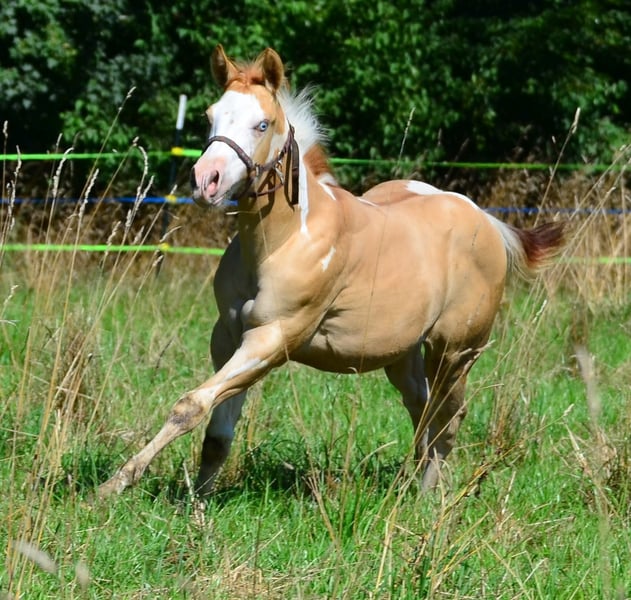 Jackson is homozygous for the Tobiano gene. He will always produce colorful foals. He has a bright blue eye. A brilliant pattern and great body! He is of course 7 Panel N/N. He is raised in a species-appropriate manner on large pastures in a big herd. He has papers from the APHA and a passport from the PHCG.