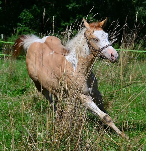 Jackson ist reinerbig für das Tobiano Gen. Er wird immer bunte Fohlen machen. Er hat ein strahlend blaues Auge. Eine geniale Zeichnung und tolle Body! Er ist natürlich 7 Panel N/N. Er wächst artgerecht auf grossen Flächen in der grossen Herde auf. Hat Papier von der APHA und Pass vom PHCG.