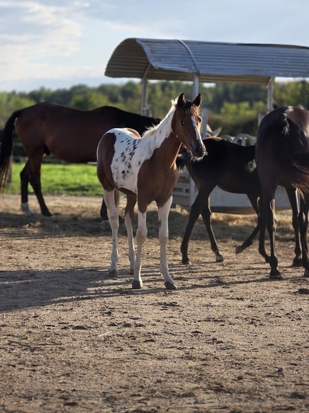 Très joli mâle OC PAINT, né le 22.04.2025. Toise adulte : entre 1m55 - 1m60 Un petit bonhomme majestueux et avec beaucoup de prestance. Le bijoux par excellence. Il se montre calme, froid et curieux. Il apprend très vite. Très bien dans sa tete et ses sabots. Il vit actuellement en troupeau composé d'hongre, femelles et autres poulains. Les boxes sont ouverts en continus, mais PERLINO connait également le boxe fermé. Il dispose de foin à volonté et de sa ration de floconné matin et soir. licolé. Pansage Ok. Aucun soucis de santé. A jour de vermifuge. En cours de primo vaccination. OK enfants, chien, poule, tracteur. Au vu de son jeune âge le reste de son éducation est encore à enrichir. Plus d’information en MP