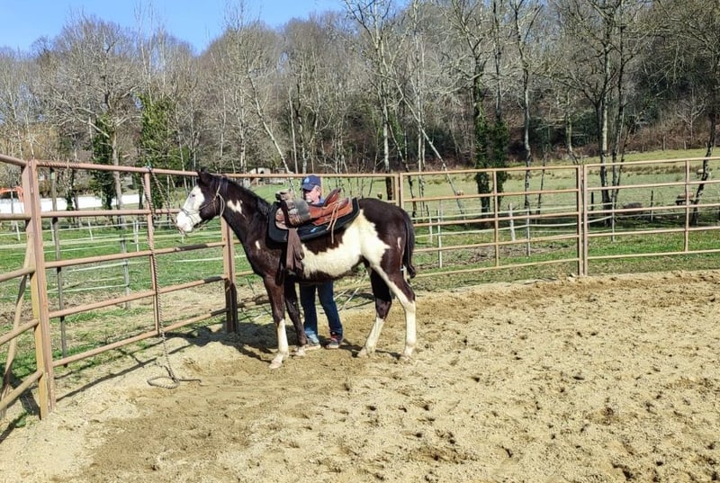 CD Namber Peppy Cat: Poulain Paint-Horse 2 ans Frame Ovéro/Black PP SIRE et US Panel 5 négatif par filiation et LWO/n car Frame Ovéro. Père Paint-Horse 2014 Spat NC Star Olena Black&White Ovéro 1.55m PP USA et SIRE, Mère Paint-Horse Haize Amber 2017 Sorrel 1.57m PP USA et SIRE. Le père et la mère sont visibles à l'élevage. C'est un gentil poulain, facile à manipuler, de tempérament calme et posé, proche de l'homme. Ce poulain sera grand(1.55/1.58), il a de belles allures, souples et aériennes. Nous le destinons à l’équitation de loisirs ou de compétition ainsi qu'à la reproduction. il peut faire un prospect Reining, Western Riding, Mountain Trail, All around et bétail: Team pening, Ranch Sorting... Nous devrions retrouver les qualités de son père qui est à la fois un très bon cheval de selle et un reproducteur de qualité. Sa mère,très bonne jument de selle all-around, bétail et d'extérieur, maintenant destinée à l'élevage. Il a été manipulé dès sa naissance suivant une méthode douce. Son travail est effectué par un professionnel. Son éducation est assurée suivant les méthodes de "Horsemanship"... Actuellement en Pré débourrage, il présente de très bonnes dispositions. Débourrage fin 2025... Contact par téléphone de préférence(laisser message)... Photos et vidéos disponibles.