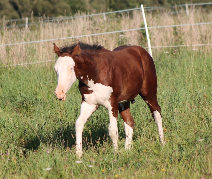 ELECTRIC SPOOK Paint Horse Hengstfohlen bay splash with blue eyes in besonderer Optik by CS ELECTRICSTARLIGHT ( Spooks Gotta Gun x Nu Chex Tu Cash ) Miss Chrome Gun by Smokin Gold Gun ( Gunner x Hollywood Dun It) Paco hat nicht nur ein besonderes Aussehen, auch sein Pedigree kann sich sehen lassen. Charakterlich ein absoluter Schatz, unerschrocken und sehr menschenbezogen. Kann ab Oktober als Absetzer ins neue Zuhause umziehen. Kennt bei Abgabe das Fohlen ABC und hat alles im Gepäck was er brauch. Wird mit APHA Papieren und E-Pass inkl. Zuchtbescheinigung abgegeben. Selbstverständlich wird er bis dato regelmäßig dem Hufschmied vorgestellt, gechipt, mehrfach entwurmt und geimpft. Paco wächst mit gleichaltrigen Pferden im Herdenverband auf. Die Mutter steht ebenfalls zum Verkauf. Wenn sie unsere Pferde kennenlernen möchten, können Sie sich gerne bei uns melden.