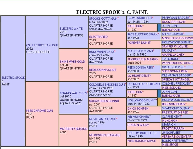 ELECTRIC SPOOK Paint Horse hengstveulen bay splash met blauwe ogen in bijzondere optiek van CS ELECTRICSTARLIGHT ( Spooks Gotta Gun x Nu Chex Tu Cash ) Miss Chrome Gun van Smokin Gold Gun ( Gunner x Hollywood Dun It ) Paco heeft niet alleen een bijzonder uiterlijk, ook zijn pedigree is indrukwekkend. Karakterologisch is hij een absolute schat, onbevreesd en zeer mensgericht. Hij kan vanaf oktober als spenen naar zijn nieuwe thuis verhuizen. Bij de overdracht kent hij het veulen ABC en heeft hij alles bij zich wat hij nodig heeft. Wordt geleverd met APHA-papieren en E-pas inclusief fokcertificaat. Natuurlijk wordt hij tot die tijd regelmatig aan de hoefsmid voorgesteld, gechipt, meerdere keren ontwormd en gevaccineerd. Paco groeit op met leeftijdsgenoten in een kuddeverband. De moeder staat ook te koop. Als u onze paarden wilt leren kennen, kunt u gerust contact met ons opnemen.