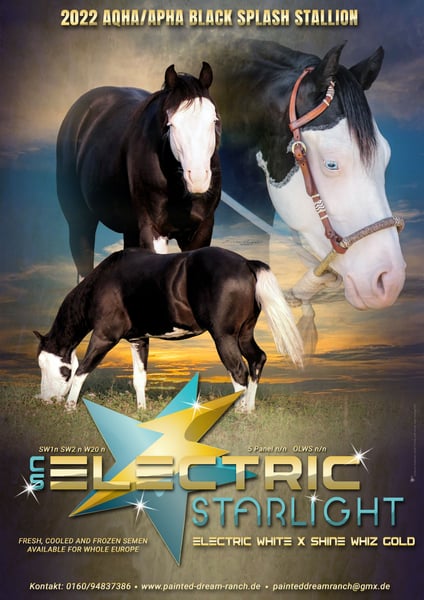 ELECTRIC SPOOK Paint Horse colt bay splash with blue eyes in a special appearance by CS ELECTRICSTARLIGHT (Spooks Gotta Gun x Nu Chex Tu Cash) Miss Chrome Gun by Smokin Gold Gun (Gunner x Hollywood Dun It) Paco not only has a unique appearance, but his pedigree is also impressive. Character-wise, he is an absolute treasure, fearless and very people-oriented. He can move to his new home as a weanling starting in October. By the time of transfer, he will know the basics of foal training and will come with everything he needs. He will be sold with APHA papers and an E-pass including a breeding certificate. Of course, he will be regularly presented to the farrier, microchipped, dewormed multiple times, and vaccinated until then. Paco is growing up with peers in a herd environment. The mother is also for sale. If you would like to get to know our horses, please feel free to contact us.