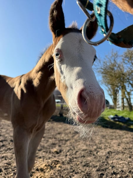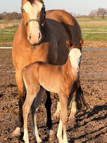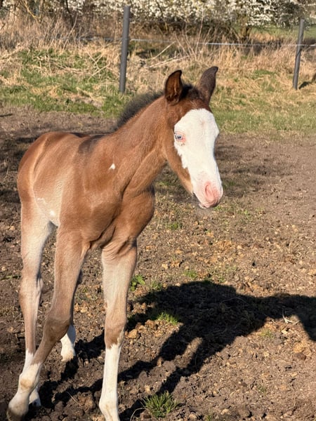 Hes A Diamond Chex ist ein hochwertiges Paint Horse Hengstfohlen, geboren am 29.03.2026, in der außergewöhnlichen Farbgebung bay dun overo splash (Farbtest läuft). Mit einem zu erwartenden Endmaß von ca. 153 cm präsentiert er sich als kompakter, korrekt gebauter und vielversprechender Nachwuchshengst mit guten Proportionen und viel Ausdruck. Dieses Hengstfohlen überzeugt nicht nur optisch als absoluter Eyecatcher, sondern auch durch seine natürliche Präsenz und seine lockere, elastische Bewegungsqualität. Durch seine interessante Abstammung eignet er sich besonders für den Reining- und Allroundbereich, ist ebenso für den ambitionierten Freizeit- oder Turnierreiter eine spannende Perspektive. Charakterlich zeigt er sich außergewöhnlich menschenbezogen, freundlich und unkompliziert. Er ist neugierig, clever und gleichzeitig gelassen in neuen Situationen. Typisch Fohlen bringt er eine fröhliche, leicht freche Art mit, bleibt dabei aber stets cool und nervenstark. Umweltreize wie Landmaschinen, Autos und alltägliche Geräusche kennt er bereits und nimmt diese völlig entspannt an. Hes A Diamond Chex wächst artgerecht im Herdenverband mit anderen Fohlen auf und wird hochwertig aufgezogen. Er erhält altersgerechtes Aufzuchtsfutter, ist regelmäßig entwurmt und gesundheitlich unauffällig. Der aktuelle 5-Panel-Test ist n/n. Im täglichen Umgang wird er konsequent, aber liebevoll gehändelt. Er kennt bereits den Tierarzt sowie den Hufschmied und wird ans Halfter gewöhnt. Das Fohlen-ABC wird kontinuierlich gefestigt. Zusätzlich kennt er das Verladen und fährt problemlos im Anhänger. Auch erste Ausflüge ins Gelände gehören bereits zu seiner Entwicklung. Dieses Paint Horse Hengstfohlen bringt beste Voraussetzungen für eine Zukunft im Sport sowie im gehobenen Freizeitbereich mit. Durch seinen Charakter, seine Nervenstärke und seine natürliche Coolness ist er sowohl für ambitionierte Turnierreiter als auch für Freizeit- und Familienpferdehalter interessant.