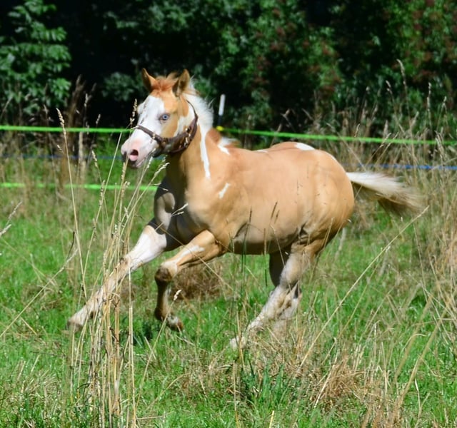 Jackson is homozygous for the Tobiano gene. He will always produce colorful foals. He has a bright blue eye. A brilliant pattern and great body! He is of course 7 Panel N/N. He is raised in a species-appropriate manner on large pastures in a big herd. He has papers from the APHA and a passport from the PHCG.