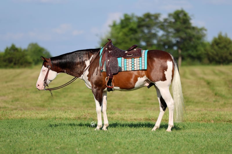 ⚜ The HERITAGE Classic ⚜ Happening now thru MONDAY | AUGUST 11th - Available EXCLUSIVELY on HorseBid's website! For more details and to register visit: www.Horsebid.com CONSIGNOR CONTACT: Premier Horses LLC 417-761-2580 LOCATION: Buffalo, MO BREED: APHA REGISTERED: Yes REGISTERED NAME: TWR Gotta Whiz Kid COLOR: Bay Overo HEIGHT: 15 AGE: 11 GENDER: Gelding Check out the pattern on Patriot, I can guarantee you have not seen one as unique as him! If you are looking to turn heads every where you go, look no further. He has a gorgeous dark bay base with the most piercing blue eyes. Patriot has a pretty long white tail and to switch things up, he has a solid black mare. How much more can you stand out? Oh, that’s right you can boast to your friends he is an own son of the legendary $7 Million Dollar Sire Spooks Gotta Whiz! If you are looking to add a superb gelding to your family that checks all the boxes, stop your search right here! Patriot has been shown and is an NRHA money earner, with his pedigree he has such a cool style all the way around. He is solid in his lead changes, flawless roll backs, and spins good. Would be a solid short stirrup or youth rider wanting to learn the basics and look sharp doing so. He is very patient with kids as young as 6 years old, either on the ground pampering him or riding him. Patriot absolutely melts in the hands of our daughter when she goes to the barn each day to give pets and treats. If you don’t have any interest in showing, that is totally fine because his resume does not stop in the arena. He does require show maintenance. Patriot is well versed on the trails and loves going on all kinds of adventures with his rider. He is a lot of fun to take across the obstacles, check the mailbox, and go over bridges on. Our daughter rides him around bareback most of the time and insists she carries the American Flag on him, he really is the best babysitter! He has impeccable ground manners and is very easy to handle. If you have ever dreamed of owning a son of Spooks Gotta Whiz, that notably stands out from the rest, do not miss out on your chance to add him to your family. Patriot is truly a remarkable gelding that will make anyone fall in love!