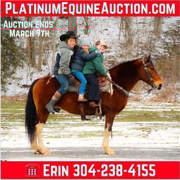 ONLINE AUCTION Place your bids at www.PlatinumEquineAuction.com Starting Bid $3500 Auction ends March 9th, 2025 Need a new saddle? Check out White Rock Saddles on our website or Facebook! This is “TOTANKA”, a super gentle, family friendly, and well trained BAY AND WHITE TOBIANO PAINT GELDING that is safe for the whole family. He has been ridden and shown by youth riders. He will lope nice circles, catch his leads, stop hard on whoa and back up. He willingly crosses streams and will travel over snowy and icy ground with confidence. This gelding will one step lope, one hand neck rein, and will not go any faster than asked of him. He rides double, triple, bareback, and in just a halter and lead rope. He loves attention, enjoys children, and is an easy keeper. He stands a stocky 14 hands tall and is 10 years old. He has excellent ground manners, can be handled by youth, and is also fine for novice and inexperienced adult riders. This gelding is stout enough to carry an adult rider and has good bone and feet. He is traffic safe, not spooky, and is a nice mover. He is the hard to find kind to come by. If you want a flashy family friendly paint gelding that the whole family can enjoy and love, don’t miss out. He has been around cattle and in the woods. If you’d like more info or want to make a Buy It Now Offer contact HH Horses Erin 304-238-4155 Located in Flemingsburg, KY. ONLINE AUCTION Place your bids at www.PlatinumEquineAuction.com Starting Bid $3500 Auction ends March 9th, 2025 Need a new saddle? Check out White Rock Saddles on our website or Facebook!