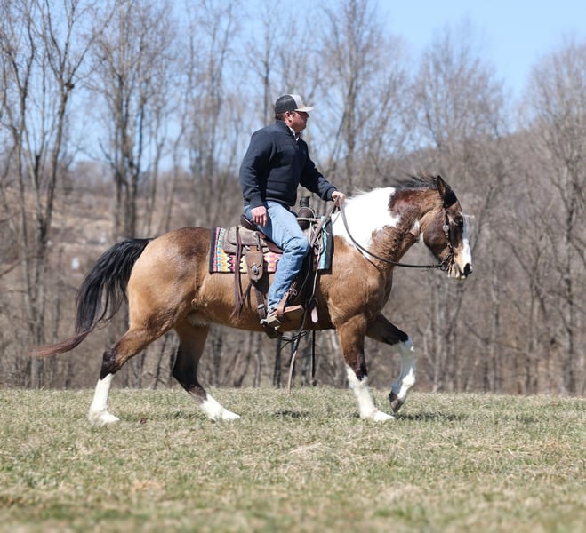 ONLINE AUCTION Place your bids at www.PlatinumEquineAuction.com Starting Bid $3500 Auction ends March 30th, 2025 Need a new saddle? Check out White Rock Saddles on our website or Facebook! Doc Holiday is a beautiful Buckskin Tobiano Paint Draftcross Gelding that is standing 15.1hh and he is a 11 years old! Doc is very stout built with a thick bone and big solid hoof, he is built for the long haul! Doc is a blue collar horse who has got up every morning and went to work making an honest living as a ranch horse. He has worked on a cow/calf operation, pasture roped/doctored/tagged. He has penned cattle at the sale barn and worked on a feedlot as well. Doc has lots of experience and is a well rounded horse that can go in any direction. He lopes nice slow circles, catches the correct leads, has a good stop and reins a circle each way. Doc is great on the trails and nothing phases him! He is content to mosey and loves going on trail rides. He will cross creeks, ditches, logs and navigate rough rocky areas. Doc has been exposed to all kinds of wildlife and will go anywhere that he is asked too. He has been rode many miles in the mountains and encountered every obstacle possible on the trail. He will go up or down even the steepest slopes, across deep creeks, over downed trees, and over all types of rough terrain while still being sure footed. Doc has been ridden down the highways and is traffic safe as well. If you want to cruise along down the trails or go out rope and tie one down Doc is a horse that will fit the bill! If you have any questions, would like to make a Buy It Now Offer or set up a Facetime Call, contact Lucky 13 Equine Matt 765-698-4655 or Lysandra 765-717-2041 Located in Brodhead, KY. ONLINE AUCTION Place your bids at www.PlatinumEquineAuction.com Starting Bid $3500 Auction ends March 30th, 2025 Need a new saddle? Check out White Rock Saddles on our website or Facebook!