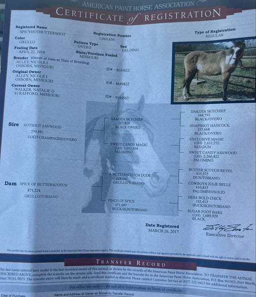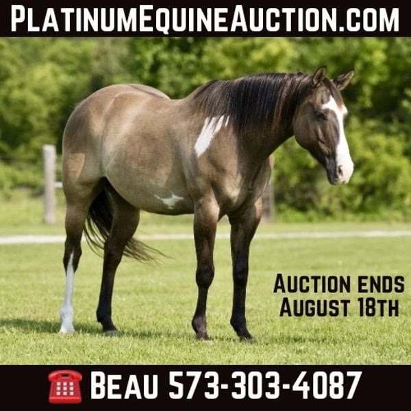 ONLINE AUCTION Place your bids at www.PlatinumEquineAuction.com Starting Bid $3500 Auction ends August 18th, 2024 Need a new saddle? Check out White Rock Saddles on our website or Facebook! Levi SpicyHotButterShot is a stunning 15.1 hand, 10 year old, registered APHA grulla paint gelding that is super gentle and has the best personality that you will ever see! Levi is super easy to catch he stands to be saddled and mounted, he has mainly been a trail horse but has also done some cattle work. Levi is very smooth in all his gaits. He will pick up both leads and lopes nice circles both ways. He would make anyone the perfect trail horse or would also be a good youth 4h or playday horse. He has No buck, No spook, he is Utd on all vaccinations, he is good in the herd with other horses and he is sound as well. For more information please call or text Broken S Equine Beau 573-303-4087 Located in Canyon, TX. ONLINE AUCTION Place your bids at www.PlatinumEquineAuction.com Starting Bid $3500 Auction ends August 18th, 2024 Need a new saddle? Check out White Rock Saddles on our website or Facebook!