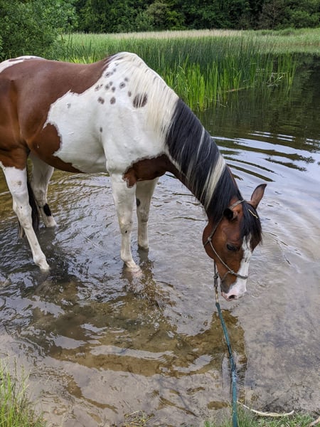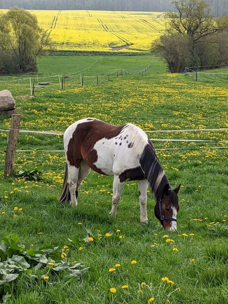 Ich möchte nach langem Überlegen meinen lieben, menschenbezogenen und hübschen 12-jährigen Paint-Horse Wallach S Already Painted Bar in liebevolle Hände abgeben. Ready hat ein Stm. von ca. 158cm. Er hat ein ruhiges Temperament und kennt Kinder, Hunde, Straßenverkehr etc. Wir waren schon zusammen im Urlaub und haben an verschiedenen Kursen teilgenommen, darunter auch ein Cutting-Kurs. Er is Barhufer. Sehr brav beim Tierarzt und Barhufpfleger. Er wird im Offenstall gehalten, kennt aber auch Aktivstall. Seine Rangordnung liegt in der Mitte. Ready wurde freizeitmäßig Western geritten. War nie ein Turnierpferd. Er hat bei mir keine Atemwegserkrankungen, Koliken oder Allergien gehabt. Leider ist er aufgrund einer Hufgelenksarthrose (vorne) nur noch sehr eingeschränkt reitbar. Leichte Bodenarbeit und Spaziergänge sind möglich. Platz vor Preis.