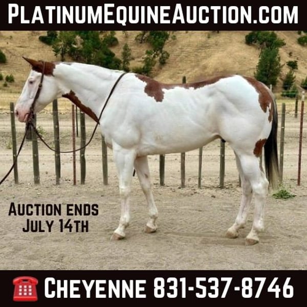 ONLINE AUCTION Place your bids at www.PlatinumEquineAuction.com Starting Bid $3500 Auction ends July 14th, 2024 Need a new saddle? Check out White Rock Saddles on our website or Facebook! Astro is a unique colored paint gelding, with two gorgeous blue eyes. Standing 14.3HH and just 11 years old. This flashy boy has more color than a coloring book, with great conformation as well. Astro is a nice steady horse who is very easy to get along with, on the ground and even more so on his back! Astro has been hauled to loud events, down crowded streets, and long windy trails! Astro has even been swam in the ponds on the hot summer days. He goes anywhere without hesitation and will cross over or through any obstacle. He carries his head collected and out of the way at all times. He’s very soft in the bridle and has an easy to maneuver neck rein. He will move off light leg pressure as well as the rein. He lopes pretty circles and has a nice collected stop and reverse. Astro is very safe for all levels, making him a great family member or a great candidate for a lesson program. You can leave Astro off for any period of time and have confidence he will be the same horse you put away. He is patient and forgiving. Will stand tied quietly, load and hauls like a dream and doesn’t move while tacking up. Astro has zero issues and is ready to find his forever family! He is located in Bitterwater, CA. For more info contact Cheyenne Rey 831-537-8746. ONLINE AUCTION Place your bids at www.PlatinumEquineAuction.com Starting Bid $3500 Auction ends July 14th, 2024 Need a new saddle? Check out White Rock Saddles on our website or Facebook!