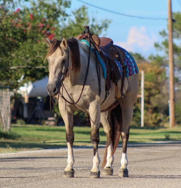 ONLINE AUCTION Place your bids at www.PlatinumEquineAuction.com Starting Bid $3500 Auction ends September 15th, 2024 Need a new saddle? Check out White Rock Saddles on our website or Facebook! Everyone meet “Rio” this guy has a heart of gold! Rio is a 12 year old buckskin paint gelding standing 15 hds tall . Rio will check all your boxes when looking for your next forever partner . He’s stout made , gorgeous color and is always ready to go out and get the job done . Rio has been used around the ranch to gather cows , check fences and load trucks on . He loves to hit the trails and will go all day long for you . He is a very confident guy and always willing to please. Rio goes wherever you point him , he’s been hauled on many over night camping trips to the national parks. He will go up and down hills , cross logs , bridges , and from the smallest creeks to the deepest water he will walk right in every time with zero hesitation. He is not bothered by campers and wildlife he handles it all with ease . Rio rides out in a group or alone , he will go wherever you place him in the group front , middle or the end . He will ride out down the busy hwy for you with heavy traffic including semi trucks flying by. In the arena he will walk , trot and lope circles always picking up the correct leads . He is very user friendly and always stays gentle taking care of his rider . Rio speaks for himself , he’s a super sweet gelding with a heart the size of Texas . Rio is the complete package that doesn’t disappoint. He is easy to catch , stands tied quietly , stands for the farrier , loads and unloads off the trailer like a perfect gentleman. He stands to be mounted, easy to saddle and bridle never giving you any issues. Contact us to come try him, or we can set up a FaceTime also. If you need help with transport don’t hesitate to ask we have a list of reputable haulers that can get him safely to your doorstep world wide. Located in Stephenville, TX. Contact M $ Performance Horses Michelle 661-817-9120 with any questions. ONLINE AUCTION Place your bids at www.PlatinumEquineAuction.com Starting Bid $3500 Auction ends September 15th, 2024 Need a new saddle? Check out White Rock Saddles on our website or Facebook!