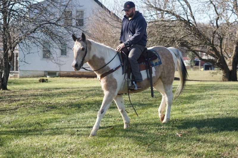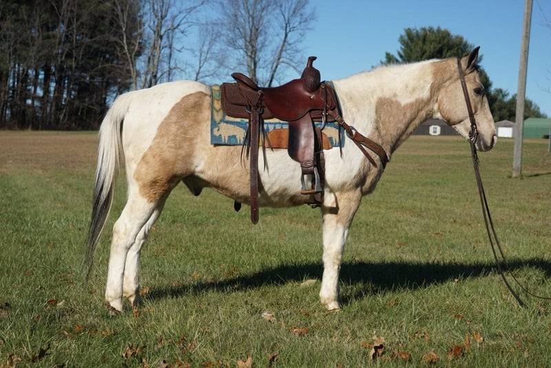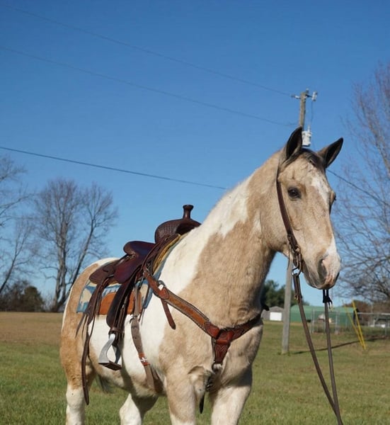 ONLINE AUCTION Place your bids at www.PlatinumEquineAuction.com Starting Bid $3500 Auction ends January 5th, 2024 Need a new saddle? Check out White Rock Saddles on our website or Facebook! Cookie Dough is a 14 year old Buckskin Paint gelding! He stands 14.3 hands tall and has a chunky build! He is cute as a button! Has pretty markings and has a great personality! He is a very laid back horse that is very simple to ride! The best part about him is he is safe! His favorite speed is slow but he will get up and go when asked! He will walk, trot, and lope! His favorite place to be is on the trails! He has been ridden all over Kentucky and Tennessee on over night camping trips! He is very seasoned out in the woods! He has been ridden in parades as well! He is easy to catch and handle and can stay fat on air basically! Super easy keeper! If you’re looking for a laid back teenage gelding to take care of you then don’t miss out on Cookie! He is cute as a button and an easy operator! Located in Rineyville Ky! Call Clayton Ryan 270-766-2641. ONLINE AUCTION Place your bids at www.PlatinumEquineAuction.com Starting Bid $3500 Auction ends January 5th, 2024 Need a new saddle? Check out White Rock Saddles on our website or Facebook!