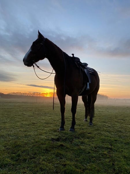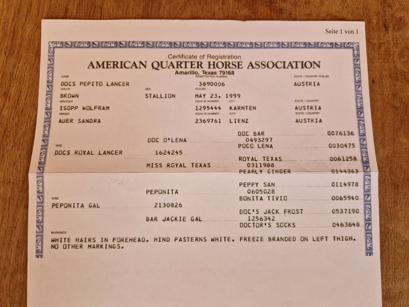 Jack is geboren in 2010, approximately 1.60 m tall. He has been with me since weaning. He is kept exclusively in an open stable and adapts very well. Currently, he is living with four mares and is the herd leader. At the age of two, I started taking him on trail rides as a ground horse, including during cattle drives. At four years old, he participated twice in professional riding lessons. Since then, he has been ridden recreationally in Western style. Unfortunately, I no longer have enough time to give him the attention he deserves. I had almost 10 years of a riding partnership with him, but my riding partner is now pregnant and will no longer be able to continue. Jack needs a person who has plenty of time to bond with him. He is familiar with ground work, longeing, arena work, and trail riding. He is barefoot and has blacksmith shoes, although he hasn't been ridden for a longer period recently. His teeth were checked in June, and his hooves are trimmed every five weeks. He is vaccinated and dewormed. A visit to the veterinarian is no problem. He does not buck, rear, or bolt. In the arena, he can be a bit lazy but works with you. My riding partner often rode him in the arena, including lessons. I mostly took him out on trail rides. Cars and tractors do not bother him. Jack is fully rideable and has no health issues. Character-wise, Jack is somewhat challenging and rather dominant. He needs a clear and confident handler. Insecure persons may find it difficult to handle him, so he is not suitable for beginners, at least not in handling. The last photo shows his sire’s pedigree. His dam was an American Paint mare without papers. See the last photos. I would like to sell him with a suitable Western saddle (California Brand Saddlery), which is included in the price. It is very important to me that he finds a good new home where he can grow old. Further information gladly by phone. This is absolutely not an emergency sale, and his future is very important to me. Price is negotiable, place takes priority.