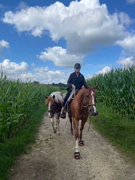 Deze knappe, zelfverzekerde jonge ruin is op zoek naar een persoon die met hem aan de slag wil gaan. Hij woont met zijn moeder en nog 2 oudere paarden in een paddock, in de regio Zuid Limburg Nederland, ca 25 min van Aken en Luik. Hij heeft vanaf dag 1 altijd beweging gehad en is op een paardvriendelijke manier opgeleid in de simpele dingen die een paard op zijn leeftijd hoort te kennen. Hij is licht in de hand, leert snel en gaat met zijn trainer alleen op wandeling. Hij kijkt niet op of om. De training bestaat nu voornamelijk uit wandelingen zonder andere paarden, losjes meelopen, wennen aan alles wat op zijn pad komt en dagelijkse dingen zoals achteruit op lichte aanwijzing, schouders en achterhand verplaatsen. Hij heeft al een singel om gehad en dat ging vanzelf. Ook snapt hij de beginselen van clickeren. Hij is nu 2e in rang en daarom is het belangrijk dat hij in een groep komt te staan waar hij niet te snel omhoog klimt, daar is hij te jong voor. Een speelkameraadje voor hem zou ideaal zijn. Boxopsluiting kent hij niet en dit zou ik ook niet willen voor hem. In de groep is hij over het algemeen rustig en komt nieuwsgierig naar je toe. Hij komt dagelijks in de hand. Ben je op zoek naar een maatje voor het leven en heb je de kennis om met een jong paard aan de slag te gaan? Dan hoor ik graag van je. Met de juiste opleiding en geduld zal hij een perfect rijpaard worden. Hij is niet bang aangelegd en vrij zelfverzekerd maar moet nog verder opgeleid worden. Hij is nog helemaal naar je hand te zetten. Door stressvrij afspenen, in een gemende kudde opgroeien, altijd vrije beweging en dagelijks in de hand komen heeft dit paard een krachtig fundament, zowel lichamelijk als mentaal. Dit zal hij de rest van zijn leven meenemen en daardoor heeft hij alles in huis om een betrouwbaar rijpaard te worden en lichamelijk gezond te blijven. Een paard moet juist niet met 3 jaar al alles kunnen. Hij is nu 152 cm maar zal nog groeien. Eindmaat waarschijnlijk 155 cm. Hij staat hoog op de benen. Geboren 03-05-2023. Moeder April Secret Moonfire 5 panel negatief. Vader Rolex Sparklin Pine 7 panel negatief. Tobiano Vos. APHA Stamboom. Nederlands paspoort. Prijs zoals voor dit ras en deze leeftijd gebruikelijk is, op aanvraag.