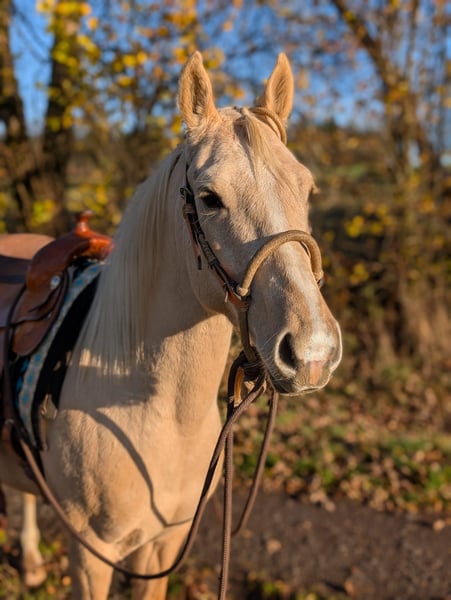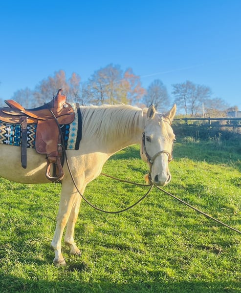 ⚜️ Buddy ⚜️ 2022 Paint Mix Stock size: 153 cm – Attention, a typo, he is actually 144 cm! Barefoot Healthy AKU available! Buddy is een stijlvolle, nieuwsgierige en leergierige allround Palomino ruin. Hij kent weidegang / open stal en nachthok! Hij is zeer sociaal en kan bij elk paard worden geplaatst. Hij heeft op grote weiden in de kudde gezond en diervriendelijk kunnen opgroeien bij de fokker en is vóór de verkoop, aan de huidige eigenaresse, nog aangebonden. Om zijn basisopleiding te versterken en verder te ontwikkelen, is hij bij ons in training geweest. Buddy toont zich ongelooflijk leergierig en staat open voor elke taak, omdat hij tot nu toe nog niets slechts heeft meegemaakt. Hij is gewend om vanaf de grond gewerkt te worden, longeertraining, ook met halster. Stangen en cavaletti-work. Onder het zadel zijn trail basics, zijgangen en alle gangarten eenvoudig en in goede hulp te rijden. Hij kan met en zonder sporen worden bereden. Hij is gewend om aan de teugel te lopen. Buiten galopperen is begonnen. Hij blijft in elke situatie stil staan. Ik kan me hem ook heel goed voorstellen in een Engels zadel en met verdere training in die richting, omdat hij heel soepel in de aanleuning is. Buddy gaat zelfstandig en in de groep alle gangarten het terrein in. Buddy is helder van geest, maar ook gevoelig en jong. We hebben een goede basis gelegd voor zijn verdere toekomst. We wensen hem een liefdevol thuis waar hij verder gestimuleerd wordt, dan wordt hij een echte „Buddy“ (vriend) waar je gewoon plezier mee kunt hebben. Actuele video: https://youtube.com/shorts/_wm1ZAjrPMQ?si=5Ai1Jl7FBixtIHDG Voor een proefrit nemen we graag de tijd en rekenen €40. Omdat Buddy momenteel bij ons nog in volledige training staat, zoeken we een nieuw thuis voor hem op opdracht. ALSTUBLIEFT, Alleen reageren bij serieuze interesse!!!