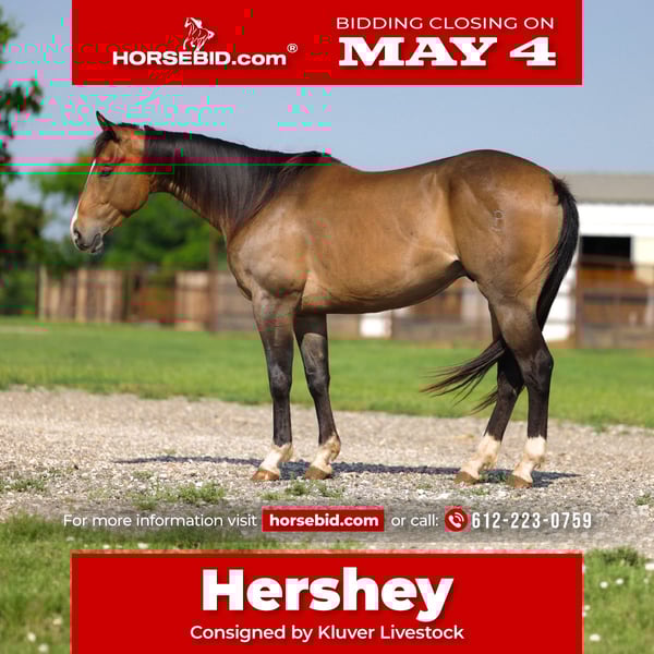 ▪️▫️◾️𝐭𝐡𝐞 𝑴𝒂𝒚 𝐒𝐞𝐥𝐞𝐜𝐭◾️▫️▪️ Happening now thru MONDAY | MAY 4th - Available EXCLUSIVELY on HorseBid's website! For more details and to register visit: www.Horsebid.com CONSIGNOR CONTACT: Kluver Livestock 612-223-0759 LOCATION: Ripley, OK BREED: Apha REGISTERED: Yes REGISTERED NAME: Chew Train COLOR: Buckskin HEIGHT: 15.1 AGE: 4 GENDER: Gelding Meet Hershey! Hershey is a 4 yr old buckskin gelding standing at 15.1 hands weighing 1000 lbs. He is a gorgeous dark buckskin with phenomenal hair genes… check out that hair! He is sound and clean legged! Hershey is as sweet as they come, he’s definitely a in your pocket horse always begging for attention! He gets along great with other horses, mares or geldings! Hershey has a great head on him he has a great demeanor and attitude. He rides around soft in the bridle, has a good stop, and turnaround. He is gentle for the whole family to ride! He has been trail rode more miles than we can count by almost all our family members! With that he has seen it all from crossing rivers, ditches, logs, muck, brush, to the animals that cross your path! He can ride alone on the trails or with a group, no matter what he’s a point and shoot horse. He has also been used out in the wheat fields doctoring cattle and for thoose long days on the ranch! He has also been used at the feed lot many times! Nothing truly bothers this horse. No funny business with him! He is a joy to own as well, you definitely won’t be getting any grey hairs with him! He is an easy keeper who always stays sound!