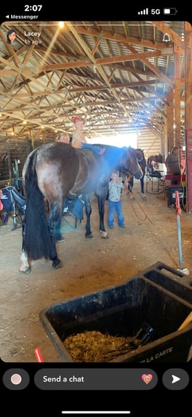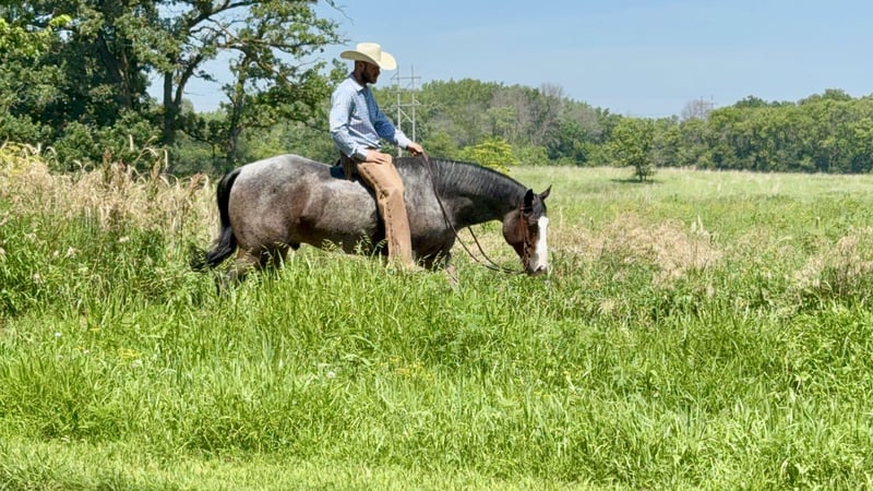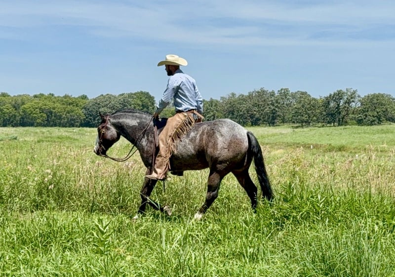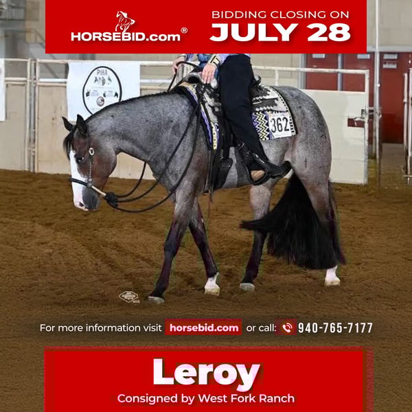 ⚔️ The HORSEMAN's Select ⚔️ Happening now thru MONDAY | JULY 28th - Available EXCLUSIVELY on HorseBid's website! For more details and to register visit: www.Horsebid.com CONSIGNOR CONTACT: West Fork Ranch 940-765-7177 LOCATION: Sheffield, IA BREED: APHA REGISTERED: Yes REGISTERED NAME: Bad Bad Leroy Brown COLOR: Bay Roan HEIGHT: 15.2 AGE: 5 GENDER: Gelding Here is a chance to by one of our personal horses that was bred and raised by us. We own his sire and dam and have been the only home he has ever had. Leroy is a 15.2 big bodied gorgeous bay roan gelding that loves people. He is a complete character and has been a puppy dog since the day he was born. Safe is an understatement with him, no matter the age of rider or experience level. We have shown Leroy in the Ranch Classes as well as Western Pleasure, where he is a money earner in both disciplines. You can speed him up and show him in the Ranch Classes and take him over all of the Ranch Trail obstacles, or slow him down for the Pleasure….either way his natural cadence and naturally gorgeous movement stands out. If you’re wanting to go trail ride or just ride down the road, Leroy is always up for that as well. Clip him without a twitch, bathe him without any hassle, you won’t have to drug him for the farrier, worming or vaccinations are no problem….he’s about as close to perfect as you’ll find. This will be a hard one to let go, but we have other young ones coming up. Call or text Amy with any questions at 641-420-0712