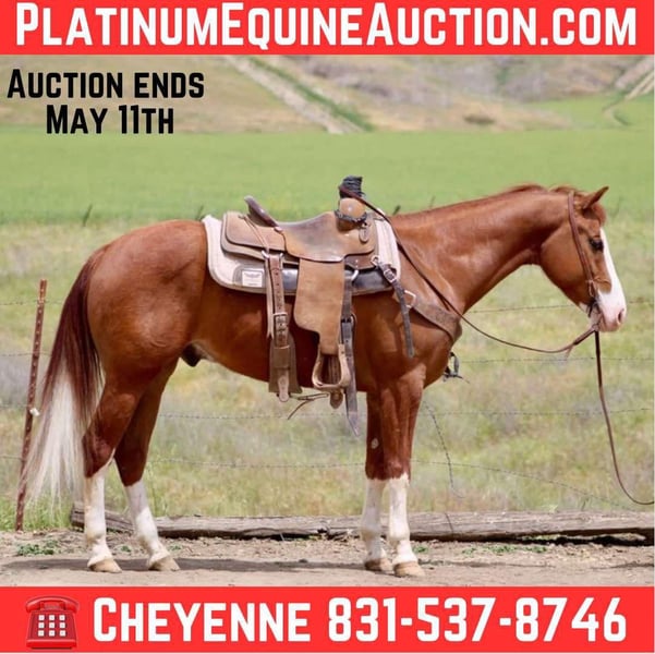 ONLINE AUCTION Place your bids at www.PlatinumEquineAuction.com Starting Bid $3500 Auction ends May 11th, 2025 Need a new saddle? Check out White Rock Saddles on our website or Facebook! Everyone loves a flashy bald face, sweet personality, and a calm demeanor! Chulo is just that and some. Standing at 14.3HH and just 5 years old, he is the most perfect combination of calmness and talented! Even though he is still young, Chulo is an old soul. Nothing phases him and he takes everything in stride! He has been hauled all over to many different places and is such a gentleman under all circumstances. He is always aware of his surroundings, but not a spooky horse at all. He has no bad habits and is safe as the day is long. He has been rode by children and beginners, down busy traffic filled streets and around loud music. He is fantastic out trail riding and goes anywhere you ask him to go without refusing. He has been used lightly on the ranch and is very familiar with cattle, even has had some roped off him! Chulo also does tricks! He is fully whistle broke and knows his name when called! He will also spread his legs for mounting, when tapped on the shoulder before you’re ready to climb up for a ride! He can be left off long periods of time and be the same horse every time. He’s very personable and loves attention. Chulo has a more whoa than go speed to him, but will still easily transition when asked to. He has a good stop and collects in the bridle. He is very light and neck reins like a professional. This horse is absolutely easy for most anyone to ride. He has a whole life long of potential in any discipline. He would be happy to continue as a compatible trail partner, so he has the talent to continue into the show world! This is the perfect young gelding with zero issues or flaws ready to find his new family to enjoy his sweet, loving qualities! He is located in Bitterwater, CA. For more info or to come out and meet Chulo, please contact Cheyenne Rey at 831-537-8746. ONLINE AUCTION Place your bids at www.PlatinumEquineAuction.com Starting Bid $3500 Auction ends May 11th, 2025 Need a new saddle? Check out White Rock Saddles on our website or Facebook!