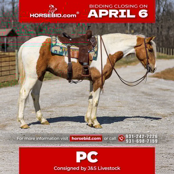🌟𝑨𝒑𝒓𝒊𝒍 𝐀𝐋𝐋 𝐒𝐓𝐀𝐑 𝐋𝐈𝐍𝐄𝐔𝐏🌟 Happening now thru MONDAY | APRIL 6th - Available EXCLUSIVELY on HorseBid's website! For more details and to register visit: www.Horsebid.com CONSIGNOR CONTACT: J&S Livestock 931-242-7226 or 931-698-7159 LOCATION: Santa Fe, TN BREED: Paint REGISTERED: No REGISTERED NAME: PC COLOR: Palomino and white HEIGHT: 15.1 AGE: 6 GENDER: Gelding PC, a stunning yet classy palomino and white gelding standing 15.1 hands tall and 6-years-old. This gelding is what trail dreams are made of and is the total trail horse deluxe package. If you are looking for something safe, steady, and reliable to take on a nice quiet trail ride to what might turn into even the roughest, sketchiest trails- without hesitation PC will be your guy. He will wade through the creeks, cross over logs, and take you up or down some pretty steep ground, while doing it slowly and safely. He has such a puppy-dog personality, so sweet and kind. He loves attention and will meet you at the gate every-time to be petted on, which makes him pretty darn easy to catch, as well. He will ride out alone, or in a group. He does good with noisy traffic, deer running through the woods, and riding through cattle. To say the least, exposure is something this guy has covered- making him an easy mount to enjoy and have fun on, while being able to feel safe, comfortable, and confident. Pc saddles great, trailers nicely, is good for the farrier, and enjoys getting bathed. He has quiet manners and would be easy for anyone to get along with. He is 100% sound and has a recent PPE. For any further information or questions please feel free to reach out. Bailey 931-242-7226 or JT 931-698-7159.