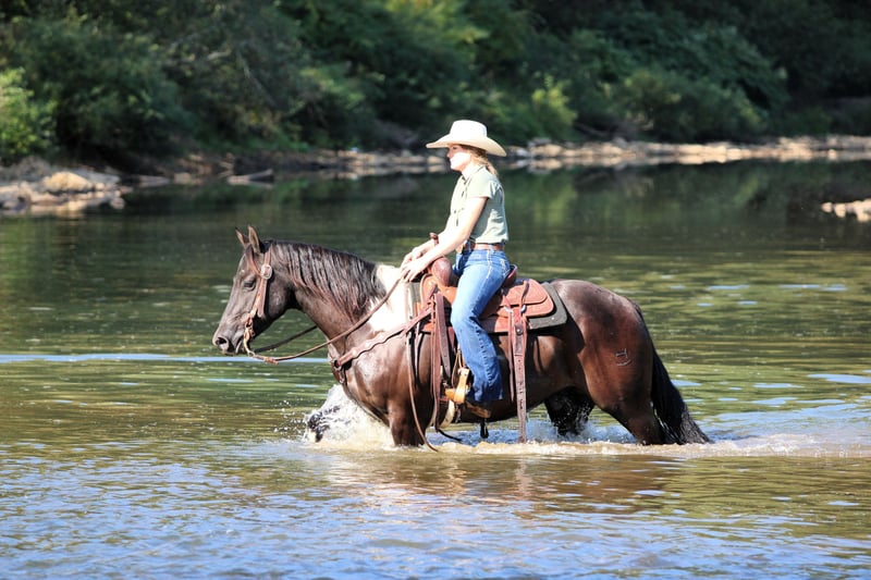 CONSIGNOR CONTACT: Rolling Rock Farms 814-924-3828 LOCATION: Miola PA BREED: Paint REGISTERED: Yes REGISTERED NAME: DB BEAU MITZI COLOR: Black paint HEIGHT: 15.2 AGE: 6 GENDER: Gelding Beau is the kind of horse you can count on day in and day out. He is a true gentleman, at just six years old he already rides like a seasoned veteran, making him a wonderful partner for riders who want a dependable horse they can enjoy for years to come. From the moment you walk into the barn he is friendly and easy to catch whether he has been in a stall or turned out in the pasture. He stands quietly to be brushed, saddled, and bathed and he loads and hauls good and without a fuss. On the trail Beau is simply outstanding. He will ride out all day on a loose rein, happy to travel in a group or head out alone. He has been exposed to dogs, farm equipment, and every sort of country terrain and nothing seems to bother him. Water crossings, wooded trails, open fields, or rocky hillsides, Beau steps through or over it all with confidence and surefooted ease. Whether you are looking for a weekend trail companion or a partner for long adventurous rides he is the kind of horse that makes the journey relaxing and fun. Beau’s talents do not stop at the trail. In the arena he is solidly broke and responsive with a true one hand neck rein, smooth lope, and the ability to lope off and catch both leads with ease. Will side pass, and offers a big deep stop. Beau is comfortable bareback and bridleless, has been roped off of, and will even carry the American flag with confidence. Thanks to his gentle nature and training Beau would be a perfect match for a confident beginner looking for a step up horse as well as riders who simply want a trustworthy versatile gelding. He is the same horse every time you ride even after time off and always saddles up and rides off like a pro. Beau sells with a current negative Coggins and a rabies vaccination so he is ready to travel and settle into his new home right away. Horses like Beau, young, well mannered, and already this seasoned, are hard to find. For questions or to arrange a time to meet this exceptional gelding please contact Ethan Shultz at (814) 924-3828.