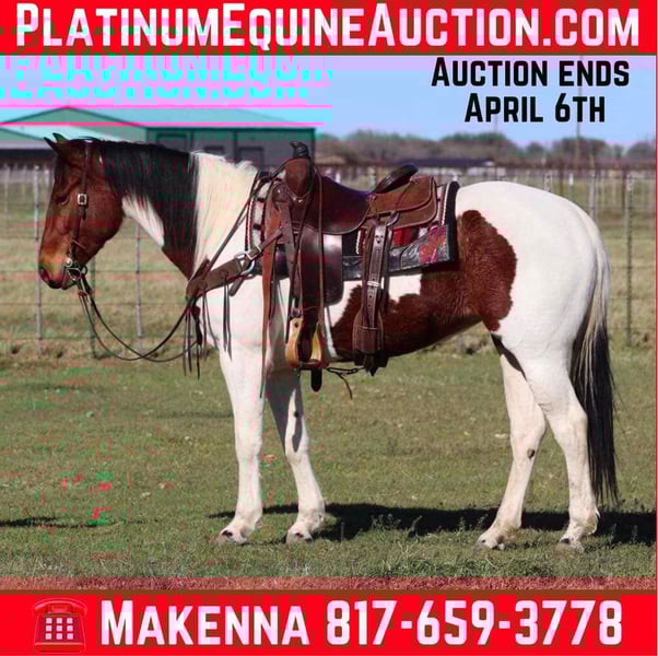 ONLINE AUCTION Place your bids at www.PlatinumEquineAuction.com Starting Bid $3500 Auction ends April 6th, 2025 Need a new saddle? Check out White Rock Saddles on our website or Facebook! How about this gorgeous gal? Loca is a finished heel horse, great trail horse, and just an all around fun mare to have in the barn! She is just 6 years old and 14.2hh tall! Loca is very handy broke, has a nice turn around, big stop and super light in the face! She moves off your legs and lopes around smooth as butter right out of her tracks. She will carry flags, is good in traffic and on roads/highways. We hauled her to the famous Fort Worth Stockyards to ride her through the busy day downtown there and she didn’t ever have a care in the world, was just happy to be there! She is turned out with other mares and geldings, low on the pecking order and gets along with everyone. She also does very good stalled and eats and drinks well on the road. She stands to be saddled, stands good for the farrier and vet, and is easy to catch! Loca is a clean slate ready for anyone to use! We are located in Lipan Texas and have hauling available anywhere in the U.S., Hawaii or Canada! Don’t miss out on the gorgeous paint mare! Please call or text Makenna Hartzell 817-659-3778 with any questions. ONLINE AUCTION Place your bids at www.PlatinumEquineAuction.com Starting Bid $3500 Auction ends April 6th, 2025 Need a new saddle? Check out White Rock Saddles on our website or Facebook!