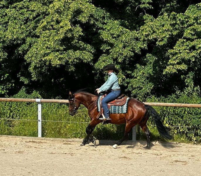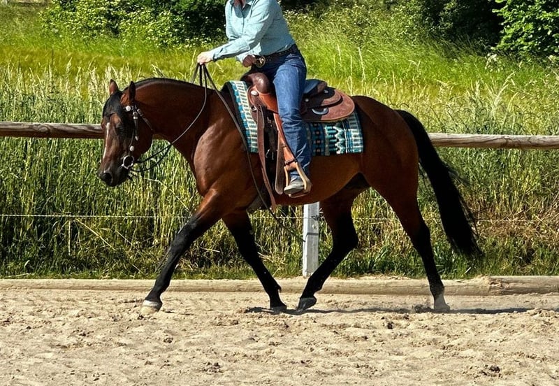 CH Gringo - ce magnifique hongre Paint Horse, né en 2019 avec une taille au garrot de 152 cm, se distingue non seulement par sa fascinante couleur baie, mais aussi par son solide et très correct fondement ainsi que son excellente lignée. Il a été le cheval vainqueur de l'évaluation PHCG en 2024. En 2025, il a été castré. Gringo possède un caractère sociable, est câlin, bien élevé et confiant. Le hongre connaît la pâture 24/7 ainsi que l'élevage en box et en stabulation libre. Il est 6-Panel n/n. Il a une très bonne formation western orientée vers le reining et a déjà de l'expérience en compétition. Il est de nouveau en dressage professionnel et est actuellement montré. Il connaît également le terrain. Gringo est très talentueux et apporte beaucoup de plaisir sous la selle. Il est un petit-fils de Gallo Del Cielo. Du côté maternel, il est issu de Andy Poco et Skips Chore. Le hongre a déjà une belle descendance. Gringo est un excellent cheval de sport et un compagnon de loisir. Il sera remis uniquement à de très bonnes mains.