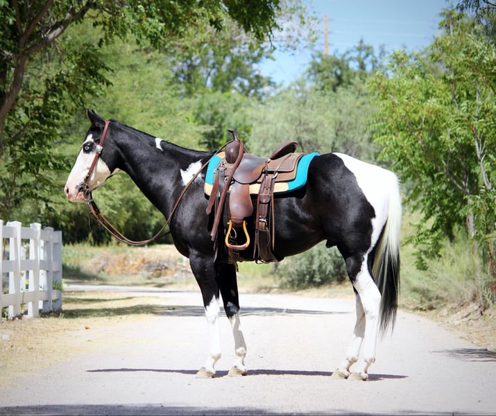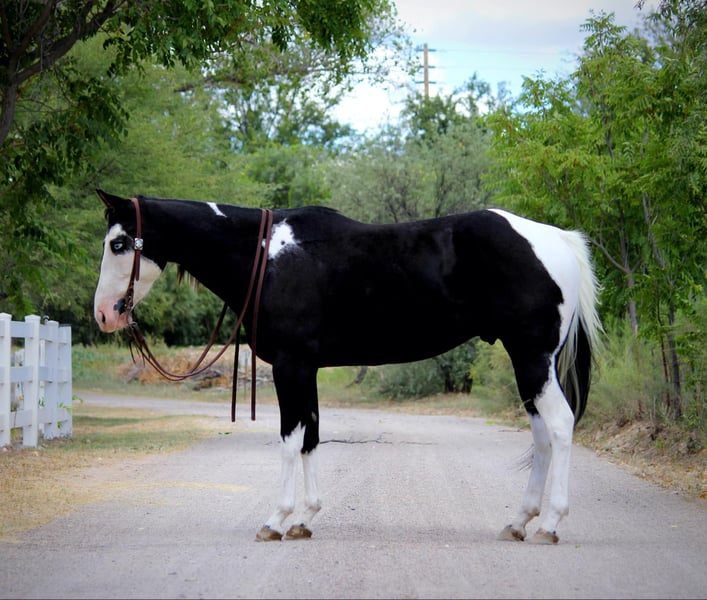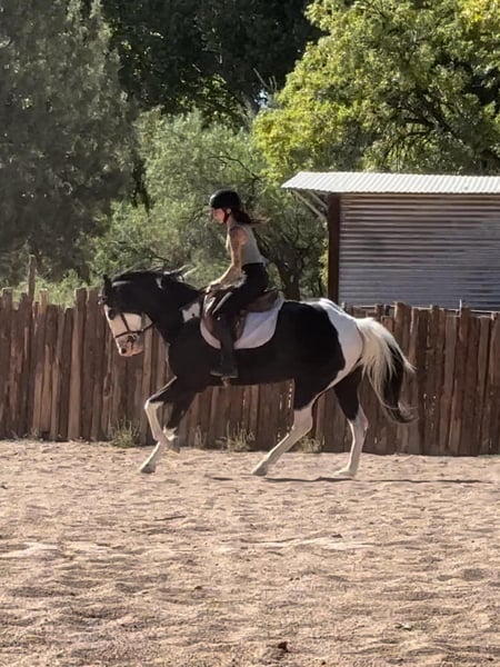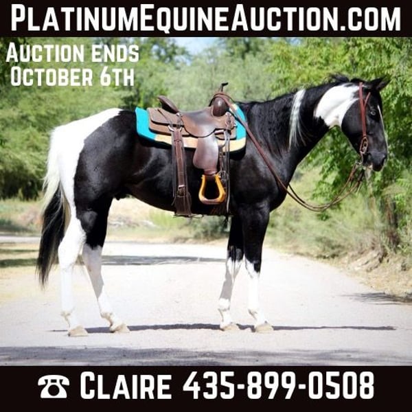 ONLINE AUCTION Place your bids at www.PlatinumEquineAuction.com Starting Bid $3500 Auction ends October 6th, 2024 Need a new saddle? Check out White Rock Saddles on our website or Facebook! It’s not every day you see a unique paint like Grimm! This guy is sure to get you noticed anywhere you take him with his flashy face and blue eyes. Grimm is a 5 year old gelding standing 15.2 hands. He is a trail horse deluxe and has been ridden all over Arizona. Water, logs, brush, slick rock are all easy for him to tackle. He rides through town without a care in the world too! Grimm rides western and English in the arena as well, and really enjoys dressage! He is soft in the face, moves off leg well and is quiet, gentle and respectful. Grimm is great on the ground as well, good to shoe, bathe, load and haul. He is UTD on coggins, vaccines, teeth and shoeing. This guy really is the total package and can do anything you ask of him. Don’t miss out on this one of a kind gelding! Feel free to call or text with any questions about this sweet boy, Claire Siebols 435-899-0508 Located in Camp Verde, AZ. ONLINE AUCTION Place your bids at www.PlatinumEquineAuction.com Starting Bid $3500 Auction ends October 6th, 2024 Need a new saddle? Check out White Rock Saddles on our website or Facebook!