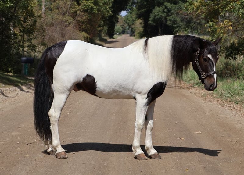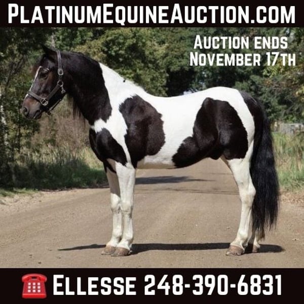 ONLINE AUCTION Place your bids at www.PlatinumEquineAuction.com Starting Bid $3500 Auction ends November 17th, 2024 Need a new saddle? Check out White Rock Saddles on our website or Facebook! Meet Barney! Here’s a kid’s pony deluxe. This little guy has thousands of hours being ridden, driven, and being handled by kids. If your kids can dream it up, I’m betting Barney has been asked to do it. Barney is a 6 year old black and white paint pony who stands a stout 13.2hh. He is beautifully marked with a gorgeous mane and tail! He’s just the perfect size for the little ones to groom, tack, and love on but he’s stocky enough for the big kiddos and small adults to hop on as well. He is a quiet natured guy who’s very simple to walk, trot, and will move into a canter with a kiss. He knows both leads, and even swaps his leads when asked. He is a kind and patient teacher. Kids can catch, lead, and groom him alone. This little guy comes with a resume a mile long. He has worked on a ranch out west. He’s been asked to round up and rope cows twice his size and he will gladly get the job done. Barney is also no stranger to the trails. He’s been in deep water, heavily wooded areas, seen wildlife, rough terrain and he is game to take his riders where ever they want to go. Barney has also worked at an English riding barn and has taught many kids the ropes of arena work. He will jump full courses as well. He jumps as cute as they come every time. Hes competed in local shows. He is also very well broke to drive. He’s been on the roads, in traffic, and used around the farm. He’s not one to shy from much of anything. Barney has been in costume parades. This is a hard pony to find as he’s just as broke as any big horse but comes in a pint sized package. He is also awesome in a back yard and will ride around swing sets, down the drive way, around kids toys, or whatever other bright ideas your kids may come up with. He would be a perfect addition to any back yard, ranch, or lesson program! This pony has irreplaceable mileage and experience! Enjoy the video he speaks for him self! Barney lives in Howell, MI 48855. Call or text Ellesse Schwartz at 248-390-6831 with any questions. ONLINE AUCTION Place your bids at www.PlatinumEquineAuction.com Starting Bid $3500 Auction ends November 17th, 2024 Need a new saddle? Check out White Rock Saddles on our website or Facebook!