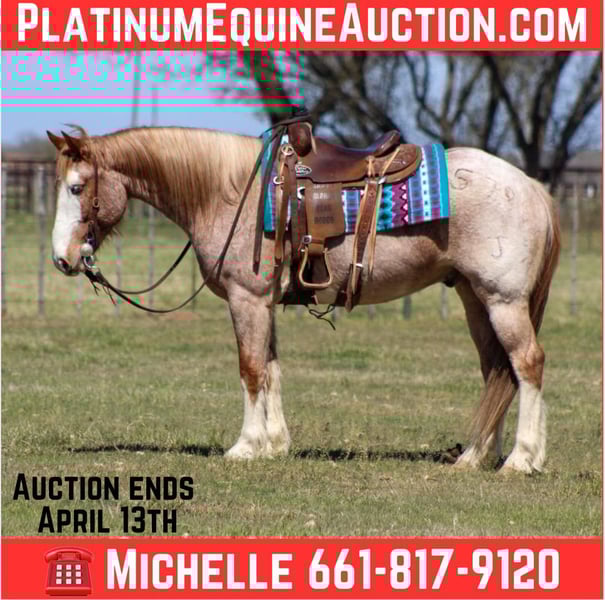 ONLINE AUCTION Place your bids at www.PlatinumEquineAuction.com Starting Bid $3500 Auction ends April 13th, 2025 Need a new saddle? Check out White Rock Saddles on our website or Facebook! Meet the COOLEST paint gelding you’ll ever lay your eyes on-2 Step! This stunning 7-year-old gelding stands at a perfect 15 hands tall and has that eye-catching draft cross look that makes him truly stand out in any crowd. With his big bone structure, solid feathered feet, and those gorgeous baby blue eyes, he’s a real showstopper and nothing will beat his one of a kind markings, there truly unique! 2 Step is not just a pretty face; he’s a true gentleman both on the ground and under saddle. Always the first to greet you at the pasture gate, he’s friendly and eager to make new friends. With a solid background working at a feedlot, he’s no stranger to hard work—he’s ridden pens, doctored sick cattle, and loaded thousands of trucks! Plus, he’s been used weekly at the sale barn penning back cattle, proving he’s as reliable as they come when it comes to a long days work. When he’s not busy working, 2 Step loves to hit the trails! He’s tackled countless miles of beautiful scenery and is more than happy to go up and down hills, cross downed trees, and navigate water and bridges. Whether you prefer riding in a group or solo, he’s got you covered. In the arena, 2 Step is a joy to ride. He’s got a fancy handle, smooth walk, trot, and lope, always picking up the correct lead, and he knows how to turn around and stop with style. He’s the best pick for carrying the American flag—what a showman and doing it in style. We absolutely adore this horse, and after spending countless months with him, we believe it’s the perfect time for him to find his forever home where he can continue to shine. He made quite an impression during his first appearance at the historic Fort Worth Stockyards, handling crowds, traffic, and even horse-drawn carriages, he loved the attention from people who wanted to take pictures and shower him with tons of pets . He handled everything like a seasoned pro and you would never know it was his first time down there in all the chaos. 2 Step is super easy to catch, tack up, and bridle. He stands patiently for baths and the farrier, and he’s currently shod with a fresh set of shoes. He gets along wonderfully in a herd and is currently living in a pasture with two other geldings. Plus, he loads and unloads from the trailer like a champ. He is ready to go in any direction you want to take him in. If you’re looking for a well-rounded, experienced, and downright amazing horse, 2 Step is your guy! Come meet him and see for yourself why we love him so much ! If you can’t make it in person that’s fine to because we can set up a FaceTime session. Need help with transport? No worries at all! We have a list of reputable haulers who can get him safely to your doorstep, whether you’re in Alaska, Mexico, Hawaii, Canada, or anywhere in between. Located in Stephenville, TX. Contact M$ Performance Horses Michelle 661-817-9120 ONLINE AUCTION Place your bids at www.PlatinumEquineAuction.com Starting Bid $3500 Auction ends April 13th, 2025 Need a new saddle? Check out White Rock Saddles on our website or Facebook!