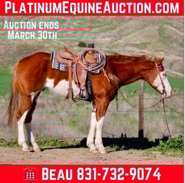 ONLINE AUCTION Place your bids at www.PlatinumEquineAuction.com Starting Bid $3500 Auction ends March 30th, 2025 Need a new saddle? Check out White Rock Saddles on our website or Facebook! Meet Big Jim, the laid-back legend of the horse world! This 7-year-old flashy paint gelding is not just a pretty face with his striking blue eyes; he’s a solid 15.1 hands of pure chill. If you’re after a horse that takes life at a leisurely pace, Big Jim is your guy. He’s all about cruising around the arena, showing off his smooth walk, trot, and lope, complete with a nice stop and a backup that would impress even the most seasoned cowboys. What’s truly remarkable about Big Jim is his easygoing nature. You could climb on him like a jungle gym, and he wouldn’t bat an eye at a waving flag, a bouncy ball, or even a tarp flapping about. He’s your trusty trail companion, ready to tackle hills, cross rushing streams, and navigate rough patches without breaking a sweat. He’s even done some cattle work checking fences and gathering. And let’s not forget his city skills! Big Jim has strutted through town like he owns the place, unfazed by honking cars or bustling crowds. He’s a dream for the farrier, doesn’t mind water, and is all current on his vaccinations. For more info or to chat about this gentle giant, reach out to Beau Mendala 831-732-9074. Located in King City, CA. ONLINE AUCTION Place your bids at www.PlatinumEquineAuction.com Starting Bid $3500 Auction ends March 30th, 2025 Need a new saddle? Check out White Rock Saddles on our website or Facebook!