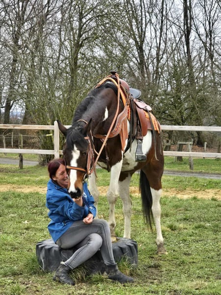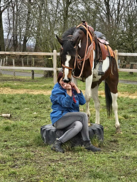 Przyjazna i niezawodna klacz rekreacyjna – Paint-Mix Belle Urodzona 30.05.2015 Wiek: 11 lat Wysokość w kłębie: około 152 cm Cena: 6 500 zł Badanie weterynaryjne dostępne ✨ Opis: Ta wspaniała klacz wyróżnia się zrównoważonym, przyjaznym charakterem i spokojnym usposobieniem. W codziennym kontakcie jest posłuszna, chętna do współpracy i bezproblemowa. Czyszczenie, prowadzenie oraz codzienna opieka w stajni przebiegają bez trudności i są przyjemne. Pod siodłem jest dobrze jeżdżalna i daje dobre odczucia podczas jazdy. Szczególnie w terenie okazuje się spokojna i niezawodna. Jeździ na relaksujących przejażdżkach, także na dłuższe wyprawy. Na ujeżdżalni pracuje z motywacją. Dzięki swojemu przyjaznemu usposobieniu jest idealną partnerką do rekreacji. Dla kogo? Dla jeźdźców rekreacyjnych szukających posłusznej, terenowej klaczy. Również dla osób preferujących spokojne przejażdżki, lekką pracę na placu oraz początkujących, ceniących sobie uczciwego konia. Nasze konie są regularnie: – odrobaczane – pod opieką kowala – kontrolowane osteopatycznie Gospodarstwo oferuje: Stajenny sklep z końskimi siodłami westernowymi, uzdzeniami i akcesoriami Transport i sprzęt na życzenie w atrakcyjnych cenach Nasza oferta: ✅ 3 miesiące gwarancji wymiany ✅ Jazda próbna: 35 €, każde kolejne konie 25 € (odliczane przy zakupie tego samego dnia) ✅ 100 € natychmiastowego rabatu przy odbiorze lub transporcie tego samego dnia ✅ Osobista i szczera konsultacja Zapytania wyłącznie telefonicznie: 0171 – 4001968 Kontakt codziennie od 8 do 20 ⚠️ Brak e-maili i WhatsAppów ⚠️ Wszystkie dane bez gwarancji