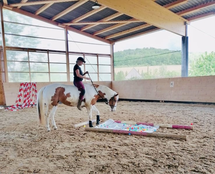 Pour ma jument Paint Horse de 12 ans et mesurant 1,56 m, Diamond, je cherche avec le cœur lourd un foyer aimant et approprié. Elle est montée en western, est volontaire, agréable à monter et adore les activités variées comme l'entraînement en selle, le travail au sol, le travail à la main, les sorties en extérieur ou le travail en liberté. Sous la selle, elle est extrêmement assidue et apprend très vite. Diamond a des papiers APHA et avec sa couleur sorrel tovero et son œil bleu, elle est vraiment frappante. Ce n'est pas un cheval pour débutants ou pour enfants – Diamond a un caractère fort, est sensible et a besoin d'une personne expérimentée qui saura gagner sa confiance, l'accompagner à travers les épreuves et continuer à la former. En octobre 2024, un asthme équin a été diagnostiqué chez elle. Depuis avril 2025, elle est en cure à la mer du Nord – avec un grand succès ! Elle est à nouveau en forme, pleine d'énergie, très musclée et prête pour un nouveau départ dans un paddock sans poussière (sans paille) avec une alimentation à base de foin. À part l'asthme, elle est en bonne santé. En raison de sa peau claire, elle a tendance à avoir des coups de soleil en forte exposition au soleil – une couverture UV et un masque UV sont disponibles. Elle est sociable avec les autres chevaux et connaît les groupes mixtes. Diamond est ferrée. Elle est vendue uniquement avec sa selle Equiflex sur mesure (2020, révisée en 2024) et d'autres équipements (pad, filet, licol, protection UV, couvertures, etc.) - inclus dans le prix ! Pas de vente urgente – seulement dans de bonnes mains ! Localisation actuelle : 26936 Côte de la mer du Nord. Une rencontre et un essai (limité) sont possibles sur rendez-vous. Malheureusement, il n'y a pas de possibilité de monter pendant la cure (pas de rond de longe, de manège ou de carrière). Photos de profil prises le 09.07.2025. D'autres photos et vidéos ont été réalisées avant le diagnostic d'asthme. **** Je pourrais écrire des tomes sur ce merveilleux cheval, qui est mon poney de rêve absolu. Je serais ravie de te raconter plus de choses en personne.