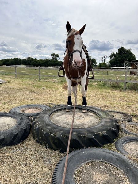 For my 12-year-old, 1.56 m tall Paint Horse mare Diamond, I am reluctantly looking for a suitable and loving home. She is ridden western, is eager to work, sensitive to ride, and loves varied activities such as saddle training, groundwork, handwork, trail rides, or free work. Under saddle, she is extremely diligent and learns very quickly. Diamond has APHA papers and with her sorrel tovero color and blue eye, she is a real eye-catcher. Not a beginner or children's horse – Diamond is strong-willed, sensitive, and needs an experienced handler who can gain her trust, stand by her through thick and thin, and continue to support her training. In October 2024, she was diagnosed with equine asthma. Since April 2025, she has been undergoing treatment at the North Sea – with great success! She is fit again, full of energy, well-muscled, and ready for a fresh start in a dust-free open stable (without straw) with haylage feeding. Apart from the asthma, she is healthy. Due to her light skin, she is prone to sunburn in strong sunlight – a UV blanket and UV mask are available. She is herd-compatible and knows mixed groups. Diamond is shod. She will only be sold with her custom-fitted Equiflex saddle (2020, revised in 2024) and additional equipment (pad, bridle, halter, UV protection, blankets, etc.). This is not an urgent sale – only to the best hands! Current location: 26936 North Sea Coast. A meet-and-greet and (limited) trial ride is possible by arrangement. Unfortunately, there is no riding opportunity at the treatment location (no round pen, arena, or riding area). Pictures of side view from 09.07.2025. Other pictures were taken before the asthma diagnosis. **** I could write volumes about this wonderful horse, which is my absolute dream pony. I would be happy to tell you more personally.