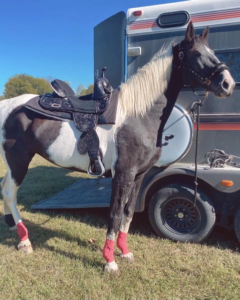 Magnifique, fiable, jument tobiano noire de 12 ans, idéale pour la randonnée !