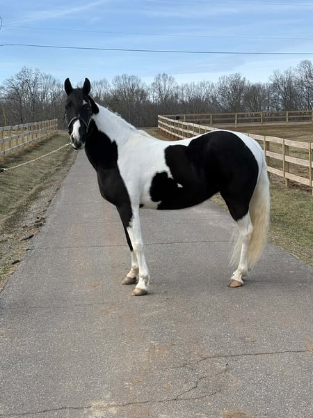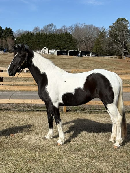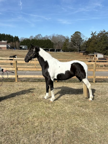"AVAILABLE ON ONLINE HORSE AUCTION AT www DOT PlatinumEquineAuction DOT com BIDDING OPEN NOW thru SUNDAY | APRIL 5TH! *Final price will be determined on auction site* CONSIGNOR CONTACT INFO: Laura Barnes 828-302-9054 LOCATION: Granite Falls, NC If you are searching for a dependable, confidence-building trail partner with eye-catching appeal, this mare checks every box. She stands approximately 15.2 hands and is 12, almost 13 years old, offering the rare combination of beauty, brains, and a truly gentle disposition. She is not marish, extremely level-headed, and has safely carried beginners, children, and inexperienced riders with ease. She is the type of horse you can let sit for weeks, then saddle up and ride off with the same calm, willing attitude. On the trail, she confidently crosses creeks, ditches, and rough terrain without hesitation. She is traffic-safe and accustomed to real-world riding, and she is sure-footed and steady even in new environments. Her natural, smooth gait makes her comfortable for long rides and enjoyable for riders of all experience levels. Her manners on the ground are impeccable. She stands quietly for mounting, tying, and grooming, and she is excellent for the farrier. She is easy to catch, meets you in the pasture, and loads and hauls without issue. She has never bucked, reared, bolted, bitten, or kicked. For more information contact Laura Barnes 828-302-9054.