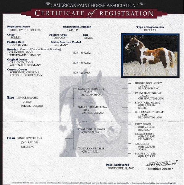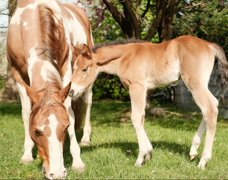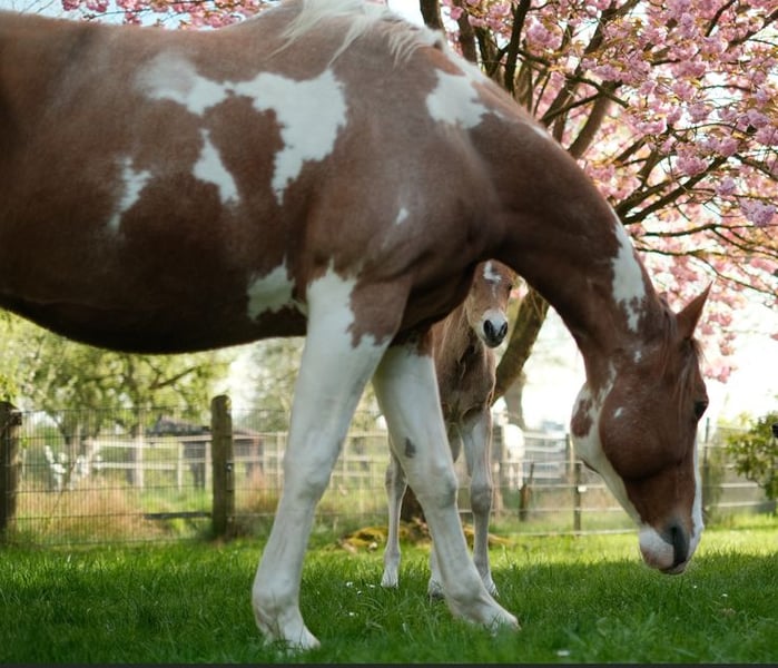 Name: Shelly Chic Olena Date of Birth: July 18, 2013 Breed: American Paint Horse (APHA, registered in the PHCG studbook) Color/Pattern: Sorrel Tobiano Gender: Mare Pedigree (excerpt): • Sire: Sun Olena Chic – Grandson of Smart Chic Olena • Dam: Kings Power Lena – Granddaughter of Fritz Power Breeding and Health Status: • Pregnant since May 2025 • Covering stallion: Quarter Horse stallion JS Ima Good Snapper (Buckskin, as shown in the last photos, recognized as a breeding stallion in the PHCG studbook) - Sire line: In Good Tune – Hollywood Jac 86 - Dam line: Red Shirley Command – Fritz Power Foals: Large, muscular, correctly built foals with good conformation. • Hereditary traits: Offspring are kept at the farm and can be viewed. • Foaling history: Always uncomplicated, very reliable in foaling. • A foal at foot is also available for viewing and purchase. Usage & Character: • Previously ridden, but no longer suitable for riding due to an injury. • Otherwise healthy and fully suitable for breeding. • Very friendly, affectionate, with excellent maternal qualities. Tel. 01707725929