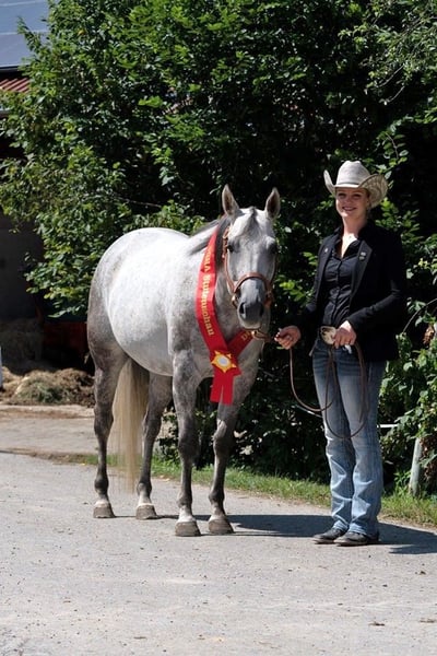 "Rita" ist eine top gezogenene, doppelt eingetragene Zuchtstute (AQHA/APHA) mit tollem Gebäude und bestem Bewegungspotential. Sie ist im Stutbuch 1 des PHCG und der DQHA eingetragen. 2019 wurde sie Reservesiegerin beim DQHA Bundesstuten Championat in Aachen und absolvierte 2021 die PHCG Stutenleistungsprüfung in Stoßberg erfolgreich. Sie brachte uns bisher 5 wunderbare Prämienfohlen und ist wieder tragend für ein April 2026 Fohlen von unserem bewährten Paint Horse Hengst GCC Lets Talk Cash. Drei Vollgeschwister (Stutfohlen) und die beiden doppelt registrierten Hengstfohlen von SQ Justified sind auf den Bildern zu sehen. Der 2020 geborene SQ Just A Modern Cowboy hat bereits Futurity Siege und Euro Paint Medaillen erreicht. Rita hat eine Basisausbildung western und kann freizeitmäßig geritten werden. Sie wird tragend wegen Zuchtumstellung abgegeben. Sie ist 6 Panel n/n getestet. X-Rays vom Import 2017 sind vorhanden und ohne Beanstandungen!