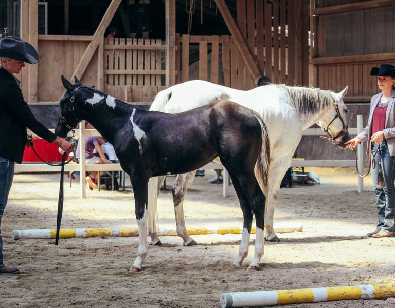 "Rita" is a well-bred, double-registered broodmare (AQHA/APHA) with a great building and the best movement potential. It is registered in studbook 1 of the PHCG and the DQHA. In 2019 she became reserve winner at the DQHA Federal Mare Championships in Aachen and successfully completed the PHCG mare performance test in Stoßberg in 2021. She has brought us 4 wonderful premium foals so far and is again pregnant for a June 2023 foal by our proven Paint Horse stallion GCC Lets Talk Cash. Two full siblings (fillies) and the two double registered colts of SQ Justified can be seen in the pictures. Born in 2020, the SQ Just A Modern Cowboy has already achieved Futurity victories and Euro Paint medals. Rita has a basic western education and can be ridden recreationally. She is given away pregnant due to breeding change. It is 6 panel n/n tested. X-Rays from the 2017 import are available and without complaints!