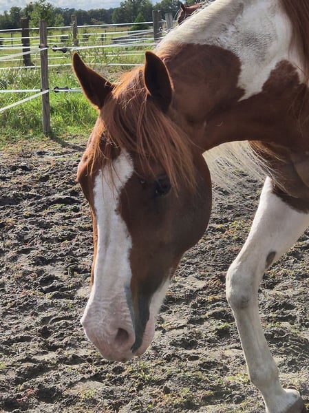American Paint Horse mare, born 6/2011, Sorrel-Tobiano, approximately 153 cm, 5 Panel N/N, veterinary check from 8/2025 available, with APHA papers. Pedigree: Sire: MHAFreckle Tari Dam: Peponita Chex Star Due to health reasons, I unfortunately have to part with my beautiful mare "Sweet Freckles Pepi." She received a solid basic training as a young horse and has since been ridden almost exclusively in the countryside. She shows herself to be very well-behaved and fearless. In the arena, she is diligent and enjoys working. She has smooth gaits and is very comfortable to ride. In the herd, she is absolutely compatible and low-ranking. She is also very well-behaved and uncomplicated in daily handling.