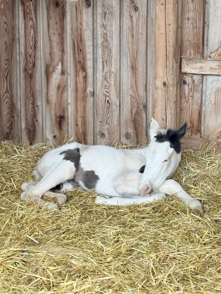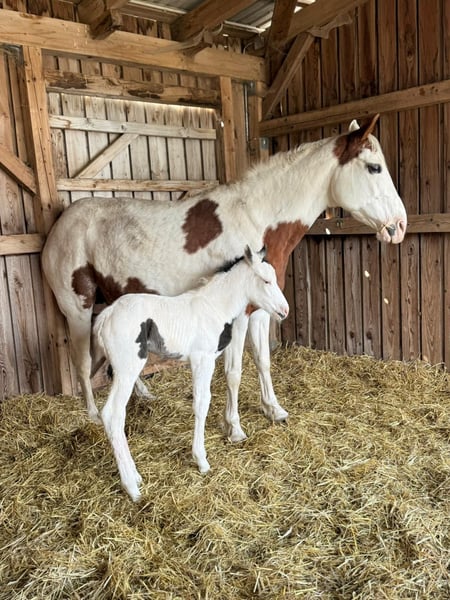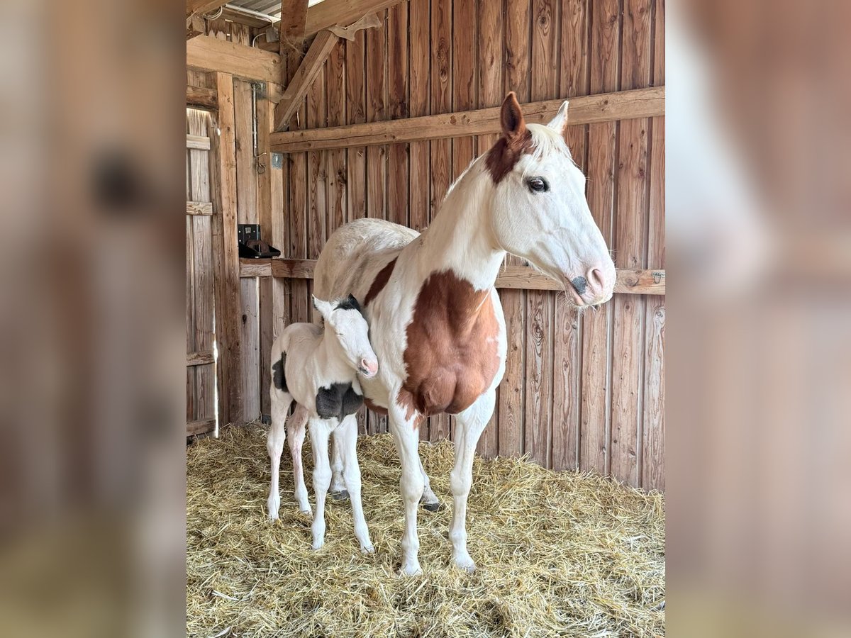 For sale is a typical American Paint Horse mare with her foal at her feet this year. Both impress with their particularly beautiful and striking markings. The mare also has a blue eye, making her an eye-catching sight. The foal also features a lovely coat pattern and has two blue eyes. The foal already shows correct conformation, curiosity, and a friendly nature. The sire is DK DANCING BOYS SMOKY. Due to this pairing, the foal is suitable for both sport and breeding. The stallion is located at our facility. The mare is a caring and reliable mother. Sale options: - Mare with foal at foot: €15,000 - Mare alone: €6,000 - Foal alone: €10,000 Only to good and suitable hands. Further information available upon request.