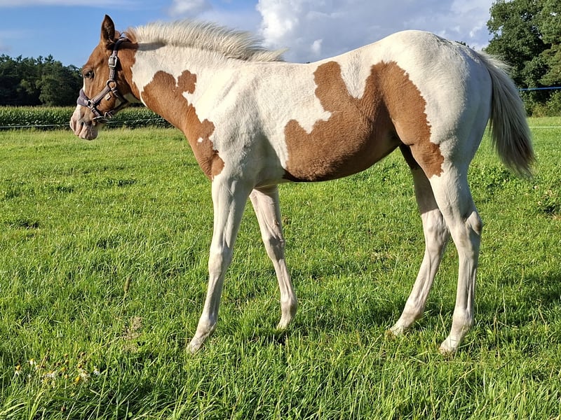 Paint Horse Absetzer Stute HAPPY BUMBLEBEE Red Dun Tobiano Geb. April 2025. Paneel 6n/n Das kleine red Dun Mädchen ist sehr Menschen bezogen und beherrscht schon das Fohlen ABC, den Schmied und das Anhänger fahren. Sie wird ca 150 bis 153 groß, ihre Mutter ist Continental Bumblebee und ihr Vater Jeannes Happy Ligth. Sie steht auf großen Weiden mit anderen Fohlen und mehreren Stuten. Sie verfügt über ein kräftiges Fundament und gute Veranlagung für den Reining oder Allround Sport. Hat einen Pass von PHCG und ein Papier von der APHA. Sie ist bereits abgesetzt und könnte in ihr neues Zuhause umziehen In fördernde Hände abzugeben Platz vor Preis Anzeige im Auftrag erstellt