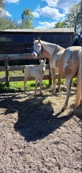 Auf diesem Weg sucht sie ihren neuen Herzensmenschen ❤️ Ein wunderschönes Stutfohlen in besonderer Farbgebung Smokey Cream aus unserer Paint Stute GB Black Jacks Dream, Bundeszuchtstute. Sie wurde Siegerfohlen in Ritterhude mit einer Gesamtnote von 8,15 . Teilnahme auf der Bundeszuchtschau in Darmstadt , Hofgut Kranichstein . Bonnie ist bereit, einen neuen Lebensabschnitt anzutreten. Sie ist liebenswürdig, sehr umgänglich, kennt das tägliche Handling, leichtführig am Halfter. Sie ist super brav beim Schmied, da sie artig steht und nicht kitzelig an den Beinen ist. Aufgeschlossen und neugierig erkundet sie die Welt und ist dabei sehr unerschrocken. Geht brav auf den Anhänger. Panel Test sowie DNA Profil liegen bereits vor. Gechippt, geimpft und entwurmt ist sie natürlich auch. Equidenpass vom PHCG sowie die Papiere von der APHA sind bereits vorhanden. Sie könnte dein zukünftiges Pferd werden. Melde dich einfach, um sie kennen zu lernen. Wir freuen uns . Standort : 23626 Ratekau Züchter und Besitzer: Frank Heldt : 0176/34507184