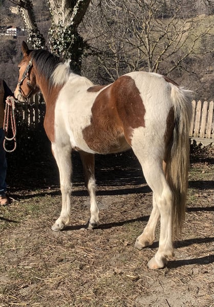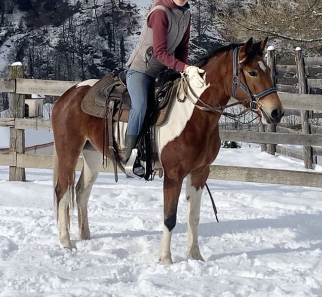 For Sale: Paint mix Mare – bay tobiano Started under saddle in the beginning of november. Calm and willing nature makes her perfect for trail riding. no problems with traffic. isn’t scared of much. she knows neck raining and is currently ridden lightly in all three gaits, mostly on the trails (max 45 minutes in one day). she goes both alone and with a group on the trails. loads easily in the trailer. is shod on all 4 feet because of bad weather and ice. currently living on a big pasture in the herd 24/7.