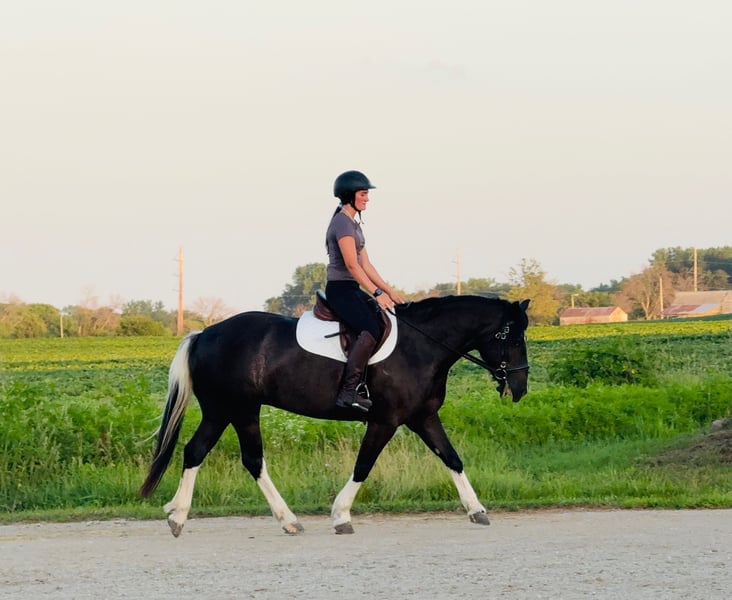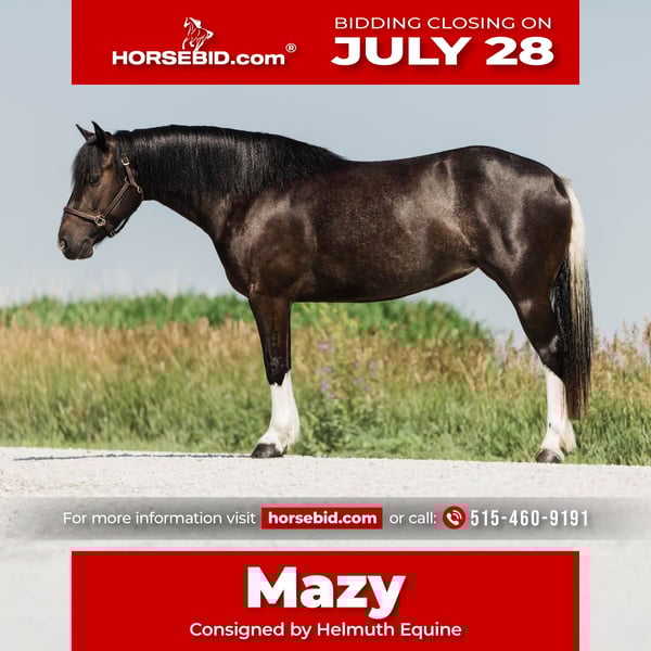 ⚔️ The HORSEMAN's Select ⚔️ Happening now thru MONDAY | JULY 28th - Available EXCLUSIVELY on HorseBid's website! For more details and to register visit: www.Horsebid.com CONSIGNOR CONTACT: Helmuth Equine 515-460-9191 LOCATION: Ames, IA BREED: Paint/Welsh Cross REGISTERED: No COLOR: Paint HEIGHT: 14.1 AGE: 4 GENDER: Mare “Mazy” is a stunning 4 year old Paint/Welsh Pony cross mare standing 14.1 hands and built like a tank. Mazy brings beauty, elegance, style, movement, talent, and sweetness all in one package! Mazy is the kind of horse that a full-sized adult can comfortably ride, yet she’s not too tall to be intimidating for a child to confidently cruise down the trail with. She lopes nice circles, responds well to leg pressure, and has the smoothest western pleasure jog you could ask for. She also has the forwardness and presence to shine in the show ring, whether it’s combined driving, pleasure driving, dressage, western dressage, ranch horse classes, or just looking super fancy going down the trail or through town! Mazy can truly do it all and turn heads while she’s at it. She is 100% sound, sane, and healthy in every way, and requires no special maintenance. She stands quietly in cross ties, at the wash rack, or tied to the trailer. Wherever you take her, she’s ready to go! Mazy is easy to catch, gets along well with any pasture mates, and is equally content living in a stall or outside. If you’re looking for a truly unique, one-of-a-kind partner who’s ready to excel in any discipline, don’t miss out on this exceptional mare!