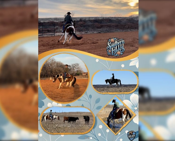 🔥MIDSUMMER CLASSIC 🔥 Happening NOW thru August 1st - Available EXCLUSIVELY on HP Bid’s website! For more details and to register visit: https://hpbids.com CONSIGNOR CONTACT: BEAR PERFORMANCE HORSES - (405) 439-0322 LOCATION: Kingfisher, OK BREED: APHA REGISTERED: Yes REGISTERED NAME: Southern Filly COLOR: Pinto HEIGHT: 15 AGE: 5 GENDER: Mare 🌸Southern Filly🌸 15 hands and Big Boned. Southern Filly is a beautiful, sweet, lovable mare with a good mind. She has been trained in a foundation for Reining/Ranch Riding that also works well for Dressage, Trail Classes, Working Cattle, or any similar guiding discipline. She has been trained to respond to a rider’s seat while on a loose rein, changing gaits or stopping based on seat cues. Southern Filly is push-style and not hot-blooded, so she is unlikely to run off with her rider. In addition to her extensive under-saddle training, Southern Filly has thorough groundwork experience. She responds to cues to move her forequarters, hindquarters, or whole body in a sidepass. She can be backed up—via lead rope pressure, nose pressure, or by wiggling the lead rope—and maneuvered while backing. She stands calmly for mounting from either side using a mounting block or fence rail, and is trained to wait for the rider’s cue to walk off. Outside the arena, Southern Filly continues to listen to the rider’s seat and cues. She can be ridden alone—away from the barn or other horses—without trying to hurry back home. She has been hauled off the property a few times and trail ridden with some exposure to light car traffic. Southern Filly has also been ridden throughout our pasture, wooded area, around farm equipment, and over obstacles like a bridge and tarp. She’s familiar with opening and closing gates, crossing water, and navigating hills, where she’s been taught not to rush. In addition, she has been used to push and gather cattle—something she really enjoys. Like many Paints, she has pink skin under her white patches that can sunburn during the high-UV summer months if left unmanaged. During peak UV hours, she does well when stalled in the shade. Southern Filly is a versatile mare with a lot to offer, whether you’re looking to participate in local shows or need a capable partner on the ranch! 🔹Registered in the Pinto Horse Association of America (PtHA) Color Registry (parentage unknown) 🔹15hands, Big Boned 🔹Good Minded, Not Mareish 🔹Push-Style 🔹Big Stopper, Can Stop Collected on a Loose Rein 🔹Goes from Trot to Lope from either a Squeeze of the Legs or Voice Command 🔹Walks, Trots, and Lopes on a Loose Rein Inside and Outside of the Arena 🔹Not just Loped in Circles, but has had Extensive Guiding Training to develop ‘Power Steering’ 🔹’Listens’ to the Riders Seat Inside and Outside of the Arena 🔹Transitions from Lope to Trot or Lope to Walk based on the rider’s Body Position While on a Loose Rein. 🔹Can Collect and Vertically Flex at the Walk, Trot and Lope. 🔹Sidepasses Under Saddle or Ground 🔹2-track at the Walk and Trot 🔹Trained in a Foundational Spin and Rollback 🔹Moves Forequarters off of the leg at the Standstill, Walk, Trot, and Lope 🔹Moves Hindquarters off of the leg at the Standstill, Walk, Trot, and Lope 🔹Backs, and can be Maneuvered while Backing Under Saddle or Ground 🔹Counter Canters 🔹Experience with crossing a bridge obstacle and going through water. 🔹Open/Closes Gates Under Saddle 🔹Taught not to rush Up or Down Hills 🔹Desensitized to a Rope (walk, trot, and lope), Plastic Bags, Stock Whip, Rain Coat, and Flag (Walk, Trot, and Lope) 🔹Not overly-Reactive to Spurs 🔹Enjoys working Cattle and is Cowy 🔹Stands Tied 🔹Hobble trained (Front and Sidelines) 🔹Stands for the Farrier 🔹Trailer Loads 🔹Easy to Catch 🔹Can be Bathed. For more information and questions about her please don’t hesitate to contact us! We have owned Southern Filly since she was a yearling and can tell you a lot about her.