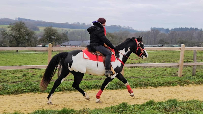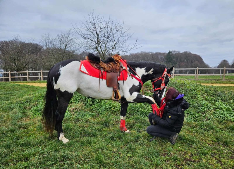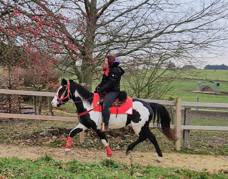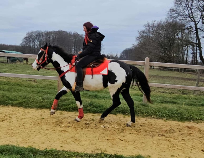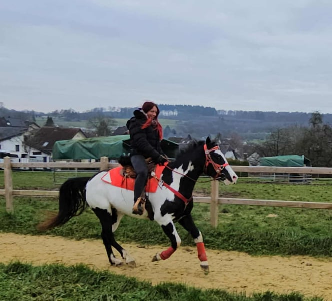 Paint Mare "Kaila" – gentle, calm, and versatile Age: 5.5 years Height: approximately 1.52 m (15.0 hh) Price: €7,600 Health certificate: available ✨ Description: This beautifully marked Paint mare impresses with her balanced temperament and friendly, pleasant demeanor. In daily handling, she is well-behaved, personable, and uncomplicated. Despite her young age, she presents herself as calm, relaxed, and resilient. Under saddle, she works cooperatively, eager to learn, and reliable. She enjoys working, is attentive, and provides a confident, relaxed riding experience. Especially suitable for leisure riding and Western disciplines, she is a versatile partner. 🐎 Perfect for: Riders seeking an uncomplicated, friendly, and dependable leisure partner. Thanks to her comfortable size, she is also well-suited for teenagers or smaller adults. Ideal for recreational riding, trail riding, and hacking. 🩺 Our horses are regularly: – dewormed – handled by a blacksmith – osteopathically checked 🛍 Farm shop: Western saddles, bridles, and accessories 🚛 Transport and equipment can be organized affordably upon request. Our services include: ✅ 3-month exchange guarantee ✅ Trial ride: €35, each additional horse €25 (credited on the day of purchase) ✅ €100 immediate discount for pickup/transport on the same day ✅ Personal and honest advice 📞 Please contact us exclusively by phone: 0171 – 4001968 🕗 Available daily from 8 am to 8 pm ⚠️ No emails or WhatsApp messages ⚠️ All information provided without guarantee